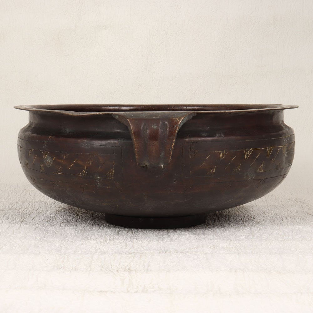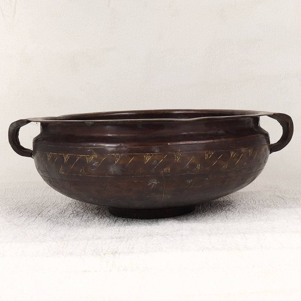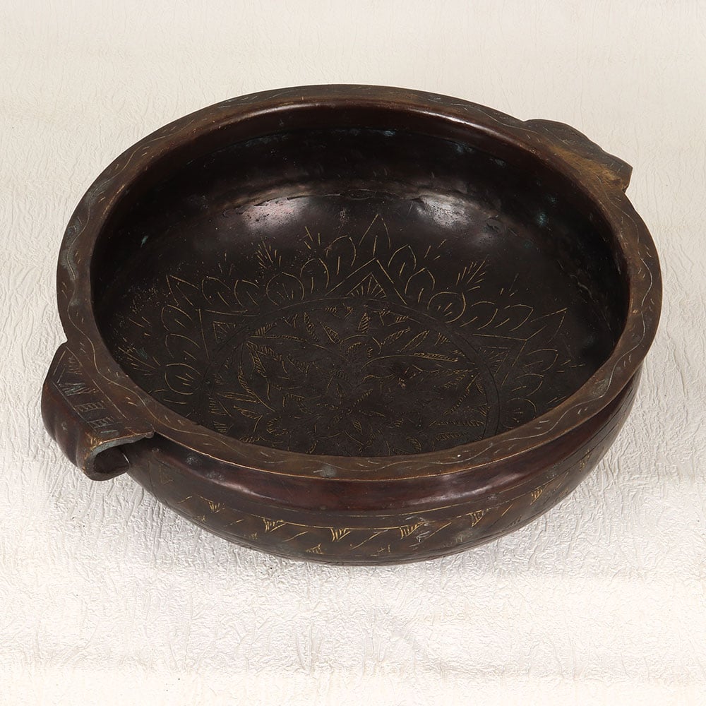 A Vintage Brass Urli which is a timeless masterpiece that seamlessly blends tradition and craftsmanship. Handmade by highly talented Indian artisans, this urli showcases their unparalleled artistry and attention to detail. Crafted from high-quality brass, it boasts a rich dark brown finish that adds a touch of antique charm to any space. The urli features two gracefully designed handles, enhancing its aesthetic appeal and allowing for easy placement or transportation. The surface is adorned with intricate engravings, reflecting the cultural richness of Indian craftsmanship. Its versatility makes it a perfect addition to various settings, be it at home, in offices, restaurants, hotels, or cafes. Primarily designed for flower decoration, this urli serves as a stunning centerpiece, creating an ambiance of elegance and sophistication. Whether you're enhancing your living space or searching for a unique gift, this Vintage Brass Urli is a perfect choice. Surprise your loved ones on special, festive, or auspicious occasions with a timeless piece that encapsulates the artistry and heritage of Indian craftsmanship.