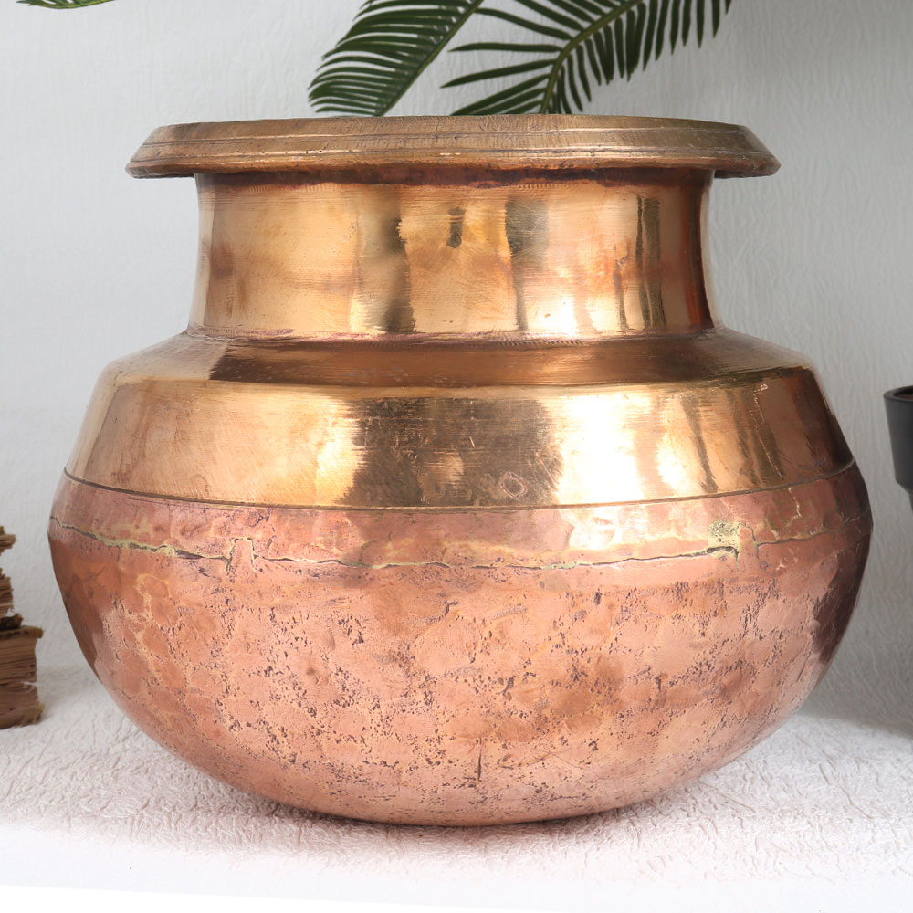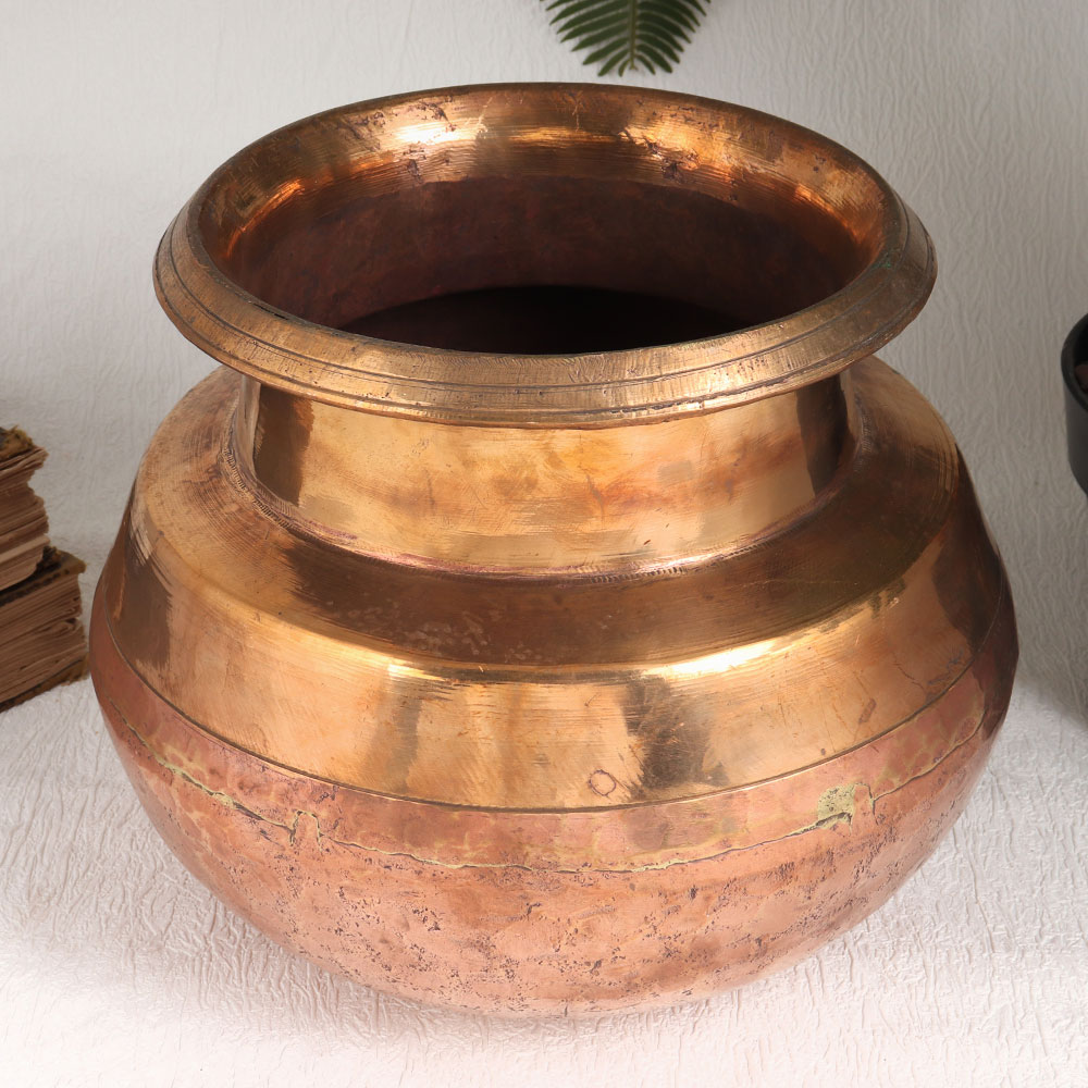 Buy a vintage copper cooking pot online in an exquisite antique golden finish and get a hassle free delivery right at your doorstep. Handmade by highly skilled Indian artisans with a passion for preserving tradition, this culinary artefact is the epitome of artistry and functionality. Crafted from high-quality copper, it exudes an aura of nostalgia, reminding us of the rich culinary heritage of India. This vintage copper pot is a versatile addition to any space, be it your home, office, restaurant, hotel, cafe, or shop. Its shimmering golden finish adds a touch of elegance to any decor. While it may no longer serve its original cooking purpose, we recommend using it for decoration or as a unique flower pot, infusing charm into your surroundings. This piece is a vintage gem, best suited for display in your vintage collection or as an eye-catching exhibit in an art or antique exhibition. It also makes for a thoughtful gift for your loved ones on special, festive, or auspicious occasions, carrying with it the legacy of craftsmanship and tradition that is sure to be cherished for generations to come.
