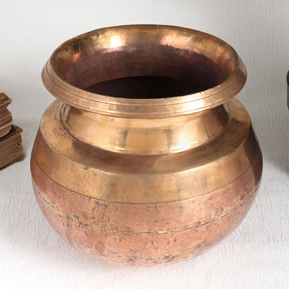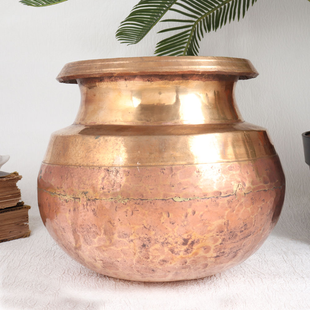 Buy a Vintage Copper Cooking Pot online that is a true masterpiece crafted by skilled Indian artisans. This stunning piece boasts a lustrous antique golden finish, showcasing the timeless beauty of high-quality copper. Handmade with precision and care, this pot reflects the rich craftsmanship of Indian artisans. Its versatile design allows it to adorn various settings, whether it's your home, office, restaurant, hotel, cafe, or shop. You can use it as an elegant decorative item or repurpose it as a charming flower pot. As a vintage treasure, we recommend using it primarily for decoration to preserve its unique charm. This pot serves as a remarkable addition to your vintage collection or can be proudly displayed at exhibitions, captivating onlookers with its aesthetic appeal and historical significance. Consider gifting this Vintage Copper Cooking Pot to your loved ones on special, festive, or auspicious occasions. It's not just a gift, it's a piece of art that carries the heritage and craftsmanship of India, sure to be cherished for generations to come.