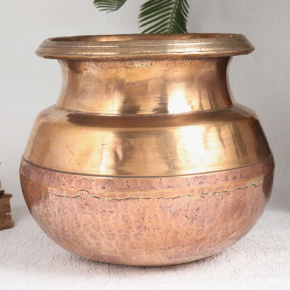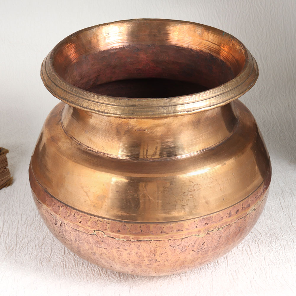 This Exquisite Vintage Copper Cooking Pot is a true testament to craftsmanship and elegance. Handmade by highly talented Indian artisans with meticulous attention to detail, this cooking pot boasts a stunning antique golden finish that adds a touch of opulence to any space. Crafted from high-quality copper, this pot exudes a timeless charm that transcends generations. While it may no longer serve its original culinary purpose, it finds new life as a versatile decorative piece. Whether at home, the office, a restaurant, hotel, cafe, or shop, it enhances any setting with its vintage allure. This vintage copper pot is a collector's dream, perfect for those who appreciate the artistry of a bygone era. It's an ideal addition to your vintage collection or a striking exhibit piece at events and exhibitions. As a thoughtful gesture, consider gifting this copper pot to your loved ones on special, festive, or auspicious occasions. It's not just a gift, it's a piece of history and artistry that will be cherished for years to come.