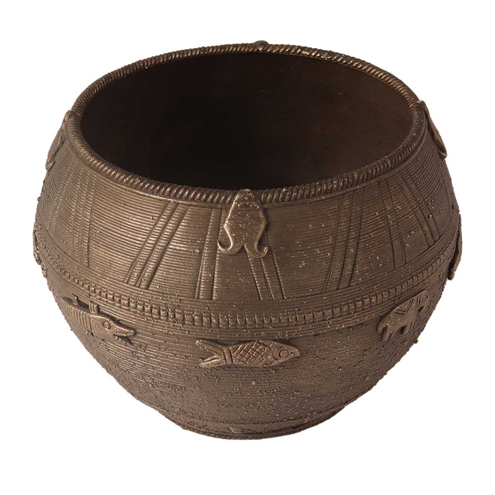 An Indian vintage style rice measurement or mana bowl for sale at a fair price. Buy this rice measurement bowl online from our website to get it delivered right to your doorstep. This bowl is handmade by skilled and experienced Indian artisans from a local village in Odisha. This beautiful bowl is engraved with elephant, fish and scorpion which makes its look more alluring. Decorate your home with this handmade pital ka lota and store small items in it or use this bowl as a flower pot on your desk, table or shelf. With its fine brown finish, it will perfectly match your vintage-themed restaurant, cafe or hotel. A gift for special and festive occasions for your loved ones.
