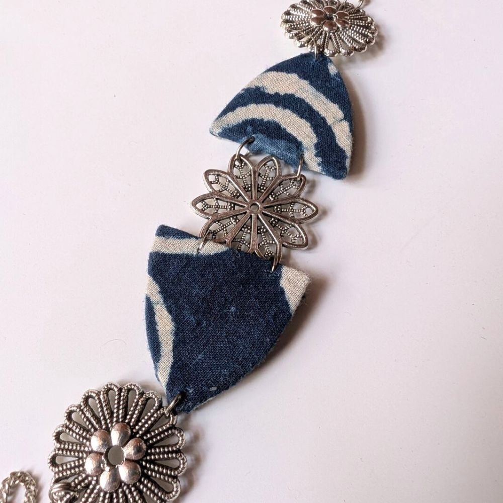 This indigo print silver choker brings a fresh, contemporary touch to traditional attire. Its triangular shape and blend of fabric and metal offer a stylish edge, making it a go-to for festive events, wedding functions, or even everyday glam. With its artistic design, this piece effortlessly enhances any outfit while keeping things elegant and fun.