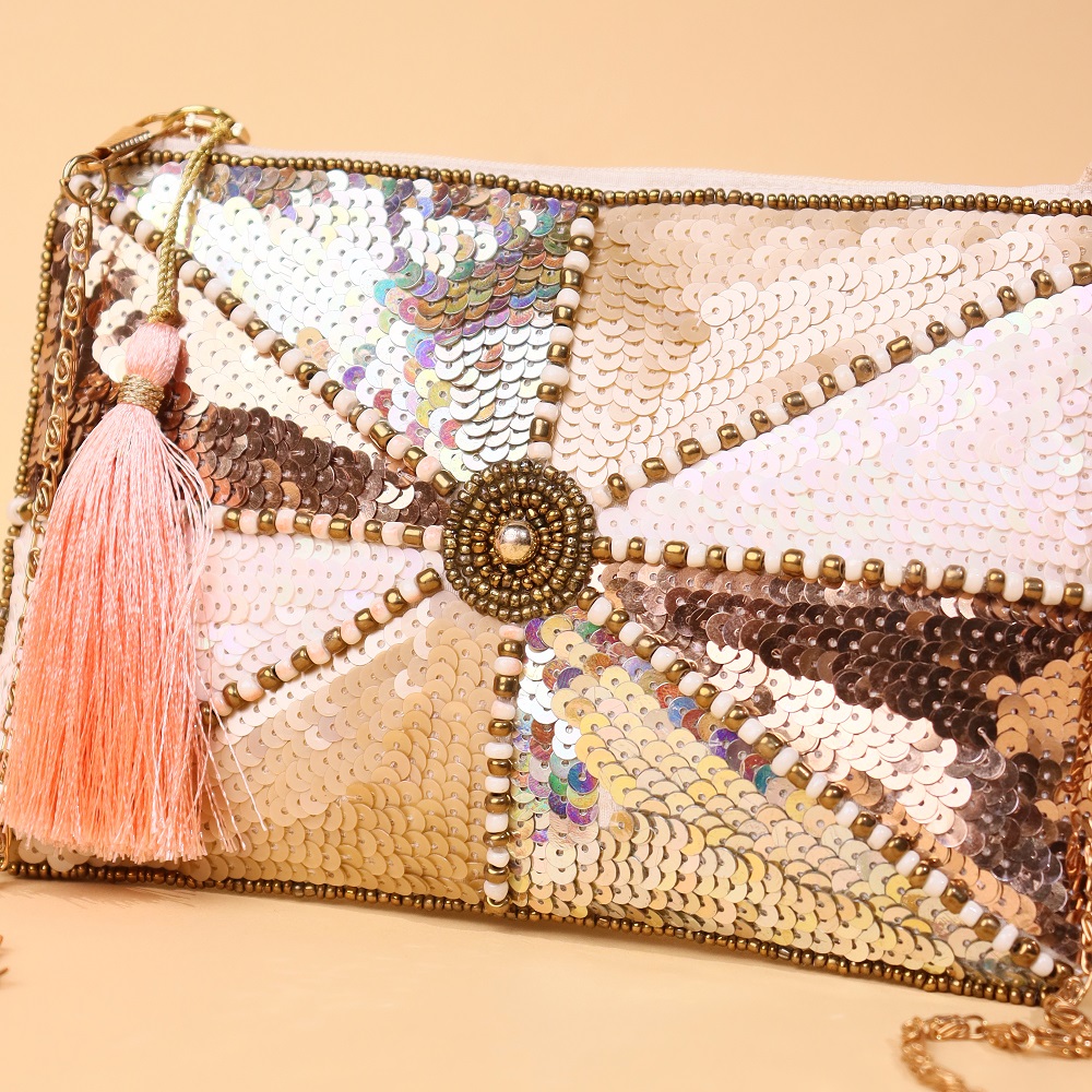 Step into shimmer with this glamorous hand-embellished clutch featuring a radiant geometric burst of sequins in gold, rose, blush, and iridescent hues. The central beaded medallion draws the eye, while the structured design is perfectly finished with a soft coral tassel for a playful yet refined touch. Whether you're heading to a wedding, festive celebration, or evening soirée, this clutch adds the right sparkle to your ensemble. Comes with a detachable gold chain strap to carry it over the shoulder or as a statement clutch.