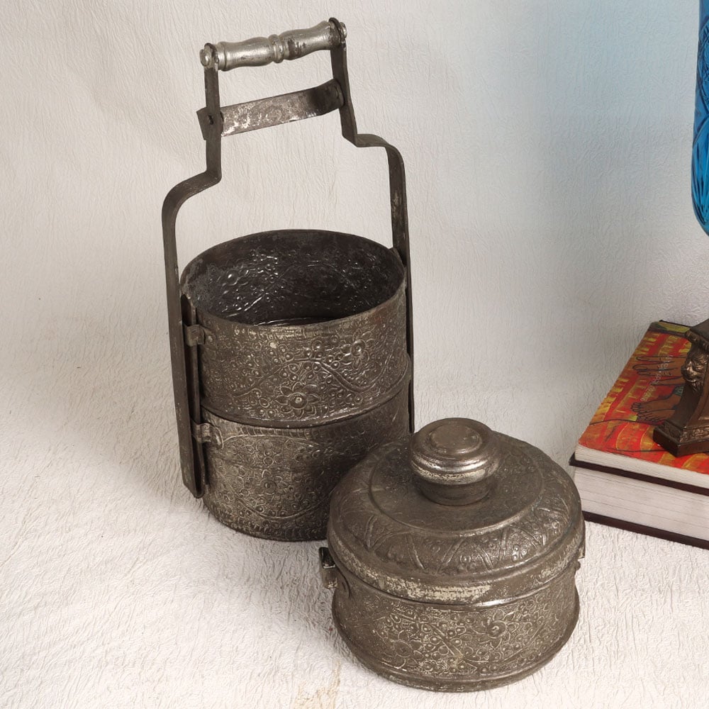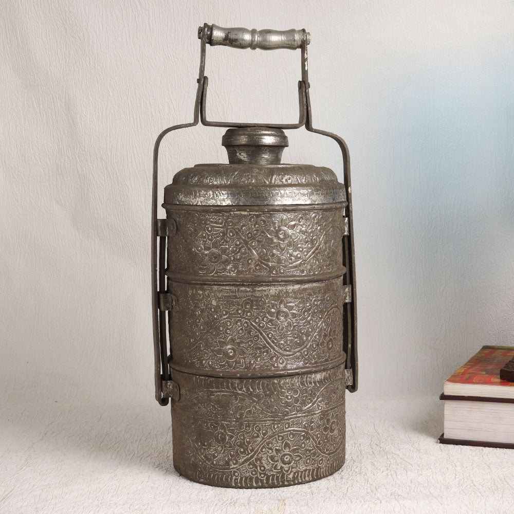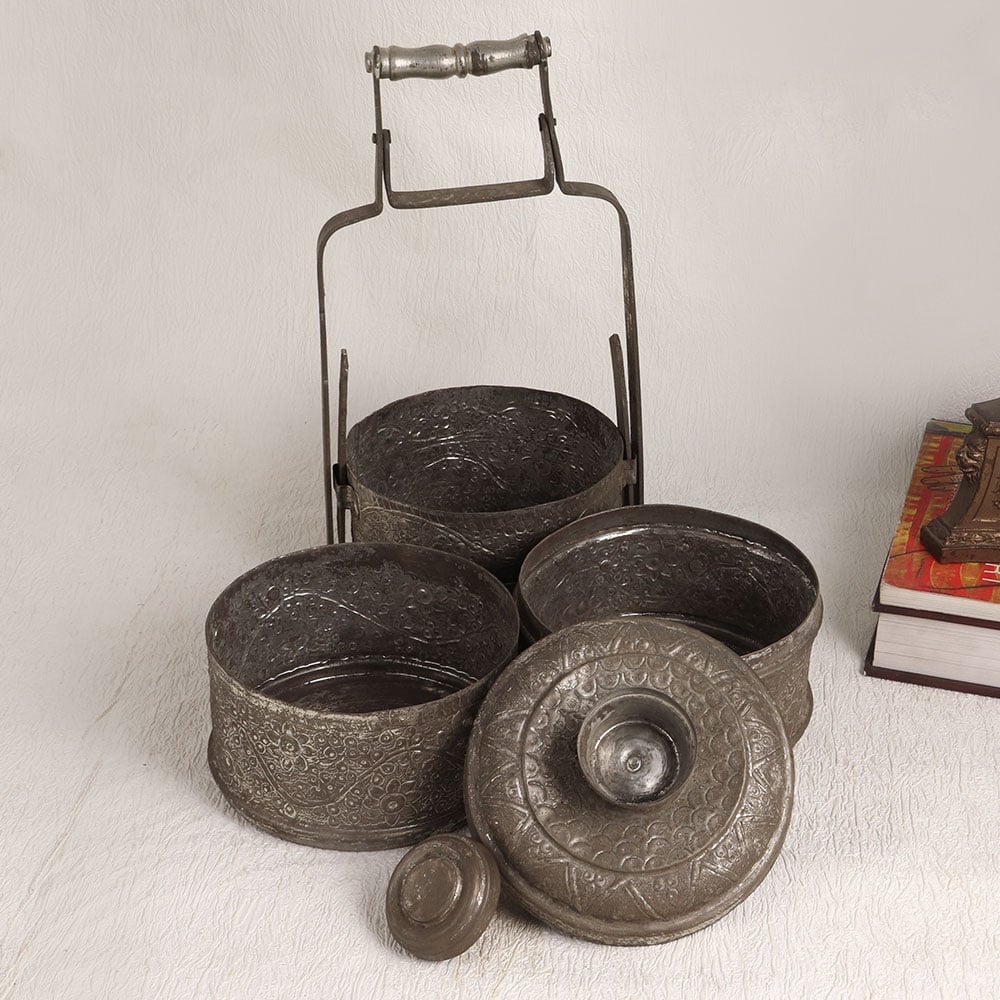 Our Vintage Tiffin Box with three compartments complete with an elegant handle and exquisite hand-carved details, all showcased in a stunning antique gray finish. This extraordinary piece is handcrafted by talented Indian artisans who have harnessed the timeless beauty of Islamic Art to create this treasure. Made from high-quality copper, this Tiffin box is not just a functional item but a work of art that brings a touch of vintage charm to any space. While its original purpose was to carry food, this vintage gem is best suited for decoration today. Place it in your home, office, restaurant, hotel, cafe, or shop to infuse a touch of nostalgia and elegance into your surroundings. Whether you're an avid collector of vintage items or seeking a unique gift, this Vintage Tiffin Box is a splendid choice. Give it to your loved ones on special occasions, festive celebrations, or auspicious moments, and let them cherish the exquisite craftsmanship and rich heritage it represents.