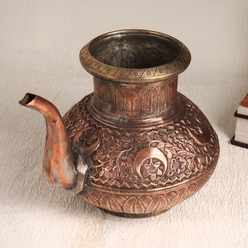 Enhance your interior decor with the timeless charm of this exquisite vintage copper water pot. Skillfully handcrafted by artisans in the heart of Hyderabad, this piece is a testament to the rich heritage of Islamic art. The pot boasts an antique brown finish that exudes an aura of age-old elegance, evoking memories of a bygone era. This exceptional water pot is a masterpiece in high-quality copper which is meticulously carved with intricate designs that pay homage to the region's cultural and artistic legacy. Its ornate spout adds a touch of sophistication, making it not just a functional piece, but a work of art. Perfect for a variety of settings, including homes, offices, restaurants, hotels, cafes, and shops, this pot is a versatile decoration. Its practicality shines during havans, rituals, and auspicious occasions, adding a touch of tradition to your ceremonies. For collectors of vintage treasures, this copper water pot is a must-have addition to your ensemble. And for those looking for a thoughtful gift, it's a symbol of love and best wishes, suitable for special, festive, or auspicious occasions.