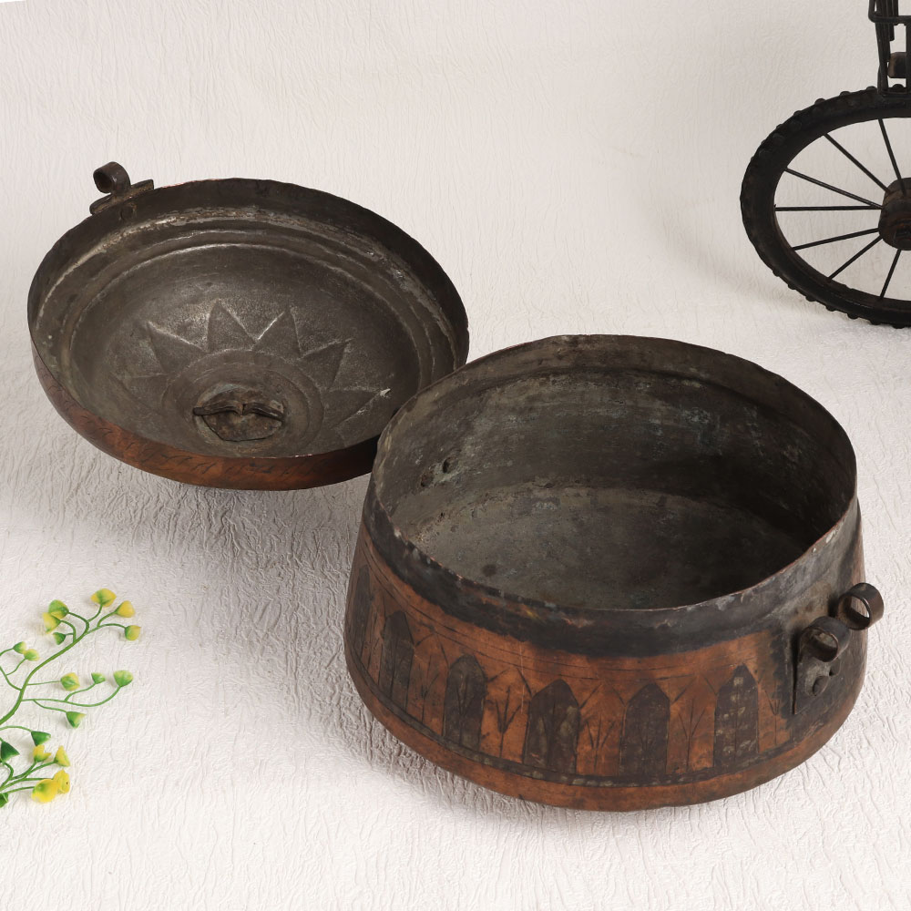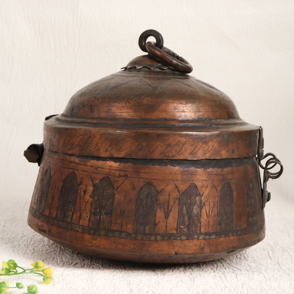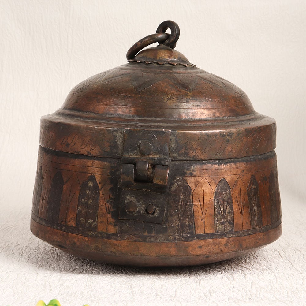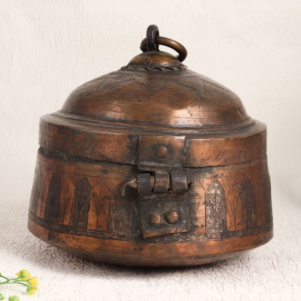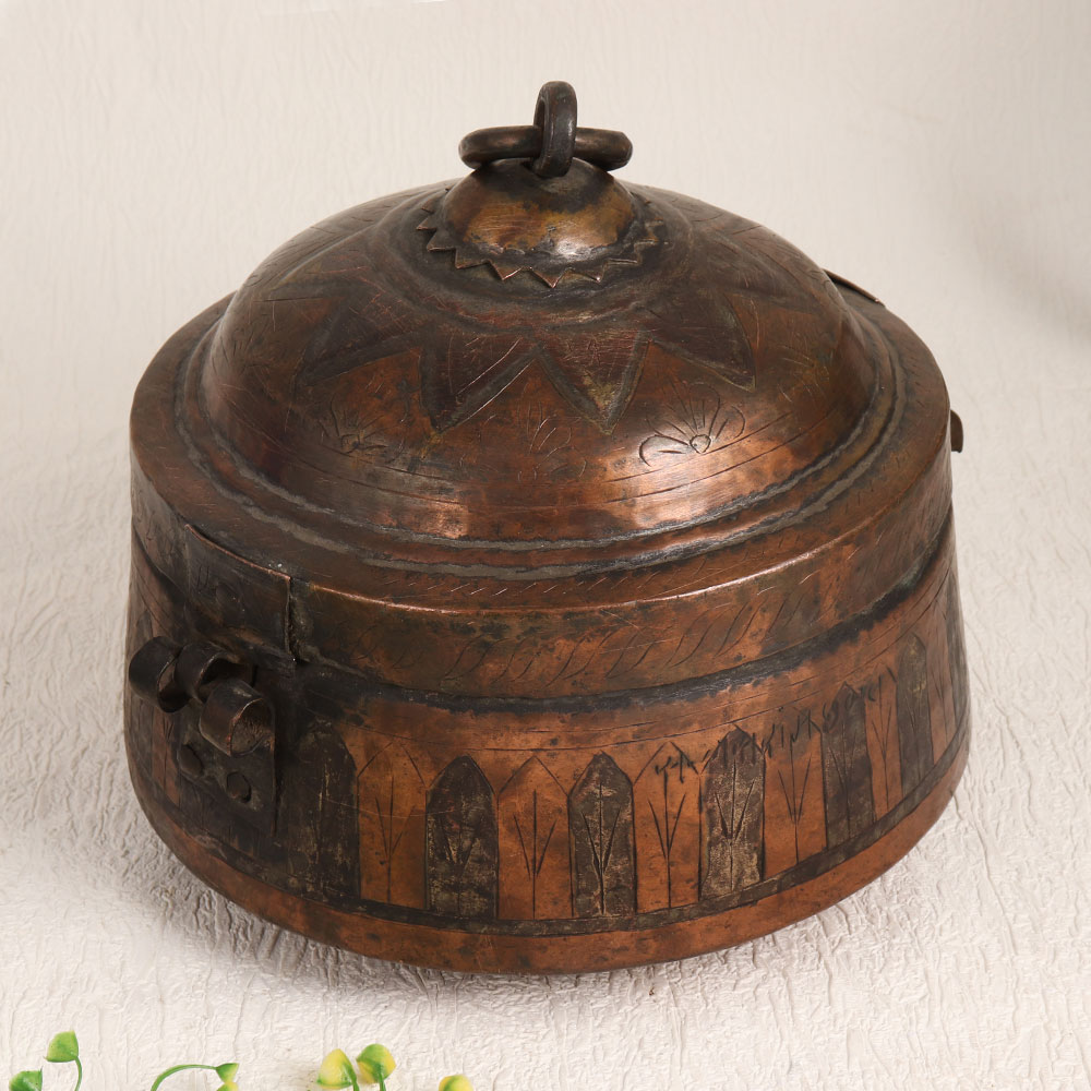 Adorn your decor with the timeless allure of our Vintage Copper Islamic Jewelry Box. Crafted with exquisite detail by highly skilled Indian artisans from Hyderabad, this stunning piece showcases the rich heritage of Islamic craftsmanship. The box features intricate carvings that pay homage to traditional Islamic design, adding an element of elegance and cultural significance to any space. Its antique brown finish exudes a warm and rustic charm, further enhancing its vintage appeal. The lid boasts a beautifully crafted ring handle, allowing for easy access to the treasures stored within. Meticulously handmade from high-quality copper, this jewelry box not only serves as a decorative masterpiece but also provides a secure and stylish sanctuary for precious stones, gems, or jewelry. Versatile in its utility, this box is suitable for various settings, including homes, offices, restaurants, hotels, cafes, or shops, making it a versatile addition to your decor collection. Whether displayed at an exhibition, or given as a thoughtful gift on special, festive, or auspicious occasions, this Vintage Copper Islamic Jewelry Box is a symbol of artistry, culture, and sophistication.