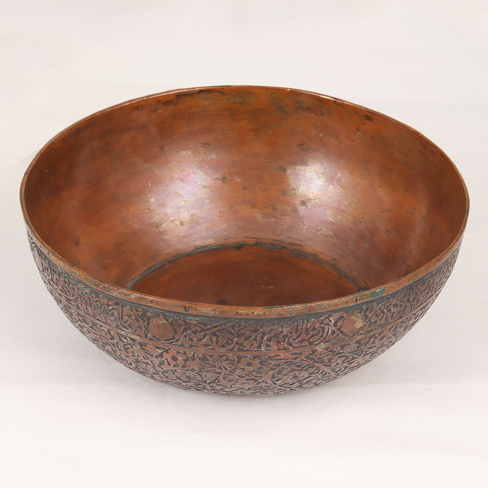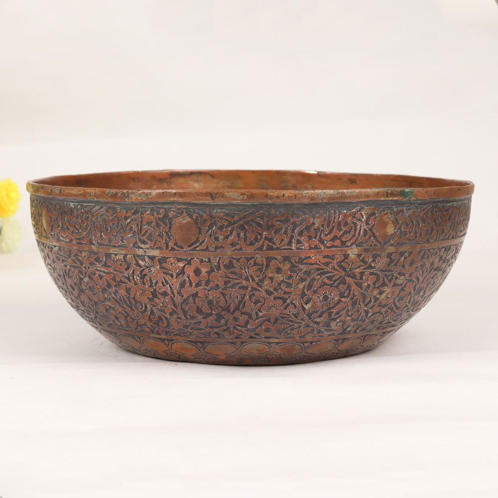A Vintage Copper Islamic Bowl which is a masterpiece crafted by highly talented artisans in Persian Art. Meticulously handmade from high-quality copper, this bowl showcases intricate engravings that tell a story of the rich cultural heritage and craftsmanship of the Persian tradition. The antique brown finish lends an air of authenticity and nostalgia, making it a perfect addition to any space. Versatile and elegant, this bowl transcends mere decoration. Whether adorning the shelves of your home, enhancing the ambiance of your office, gracing the tables of a restaurant or hotel, or adding a touch of sophistication to a cafe, its allure is undeniable. Embrace its multi-functional appeal by transforming it into an indoor flower pot, bringing nature's beauty indoors with a touch of historic grandeur. This vintage masterpiece is not just an ornament but a testament to a bygone era. A perfect addition to any vintage collection, this Copper Islamic Bowl also makes for a thoughtful and meaningful gift for your loved ones on special, festive, or auspicious occasions.