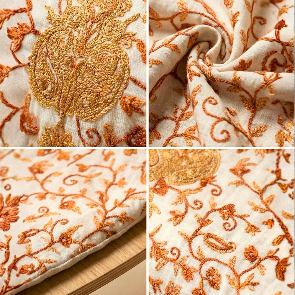 • Hand-embroidered vine motifs inspired by classic Kashmiri textile traditions