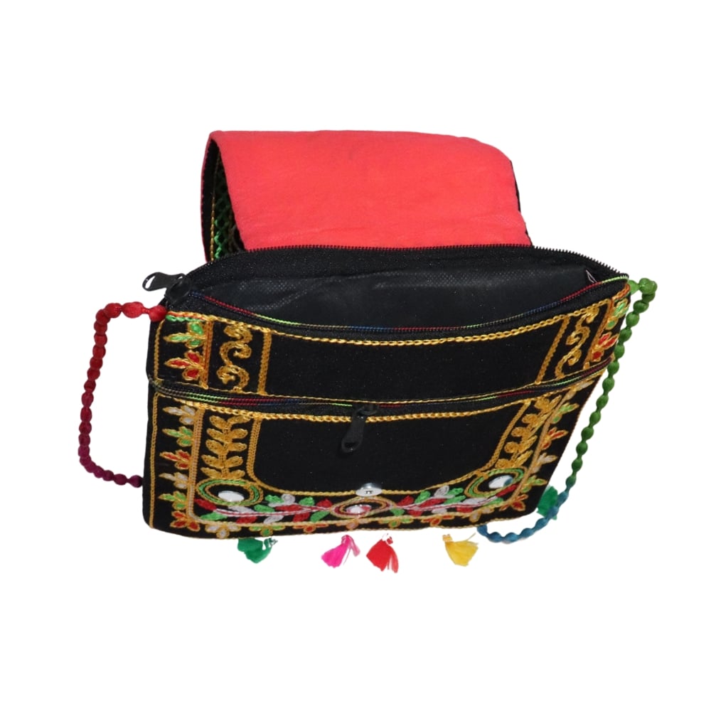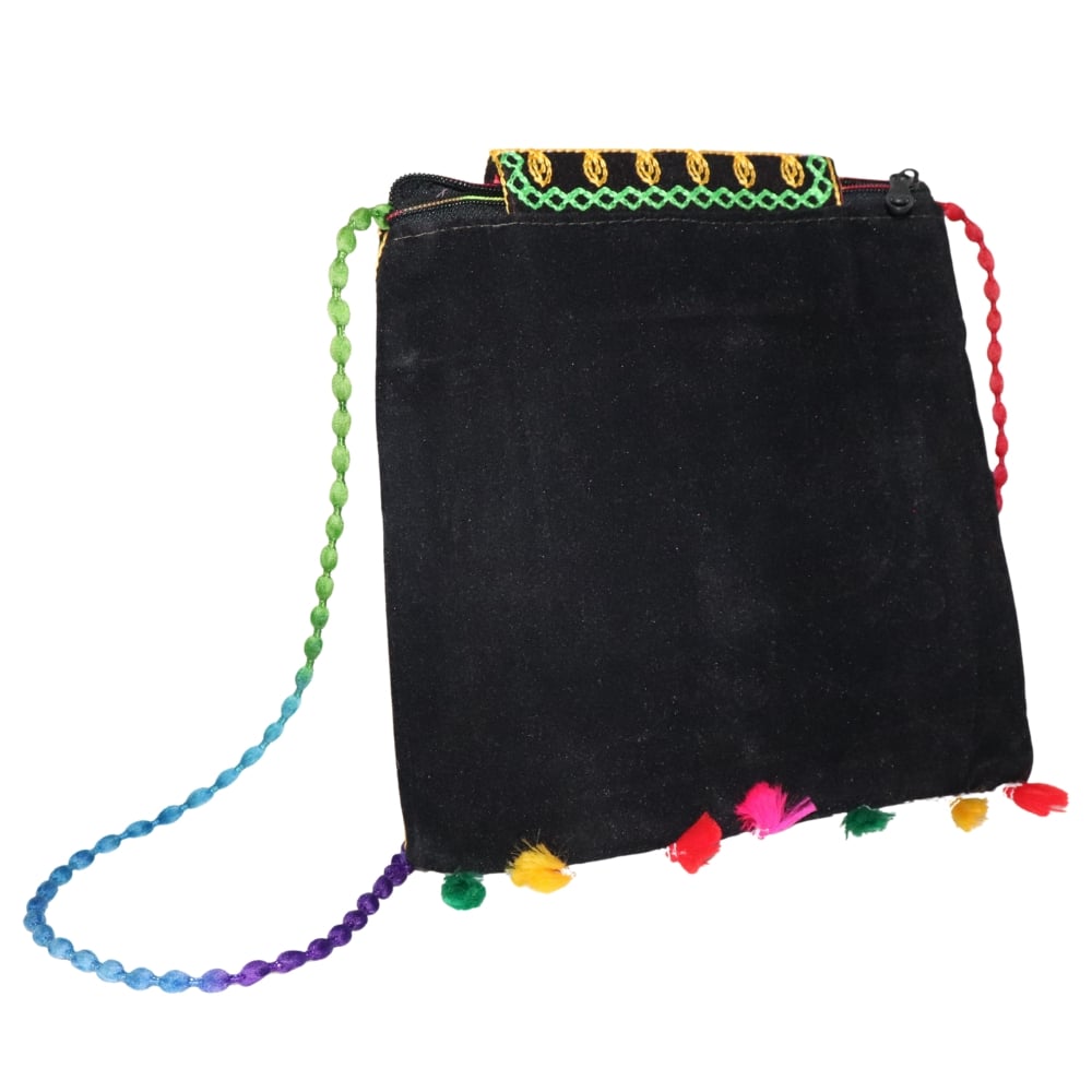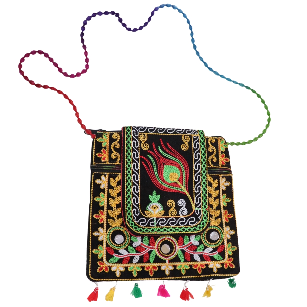 Make a bold style statement with this exquisite Jaipuri Handmade Embroidered Sling Bag, featuring a striking peacock feather motif on a rich black cotton base. Skillfully handcrafted by Rajasthani artisans, this bag showcases intricate embroidery, traditional mirror work, and vibrant floral patterns framed with golden threadwork. The flap design, accented with a multicolor braided strap and playful tassels, adds to its ethnic and bohemian charm. Lightweight yet durable, this compact crossbody bag is perfect for carrying essentials like your phone, wallet, and keys, whether you’re attending a cultural event, festival, or a casual outing. The secure flap closure and detailed craftsmanship reflect the spirit of Jaipur’s heritage. Ideal for women who appreciate handmade, eco-friendly, and artistic accessories, this sling bag beautifully blends tradition with modern-day functionality. Carry a piece of Rajasthan wherever you go with this eye-catching and meaningful fashion accessory—perfect as a unique gift or personal statement piece.