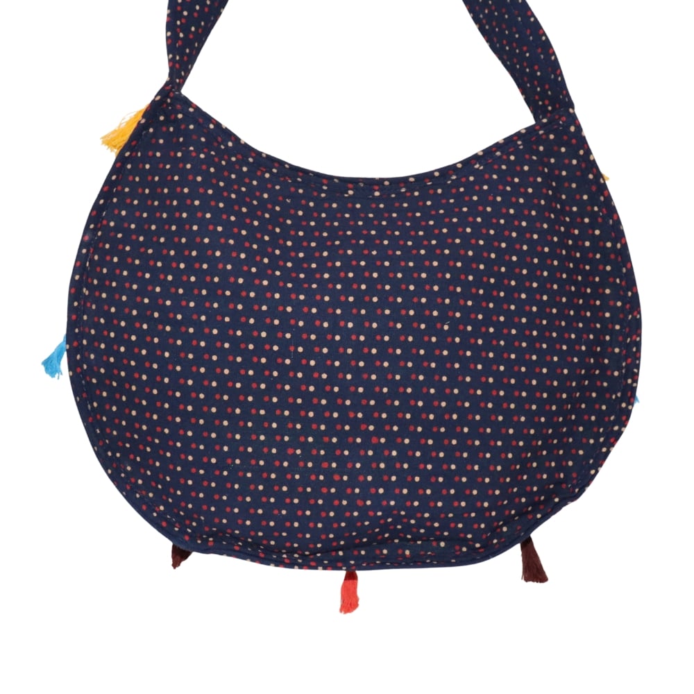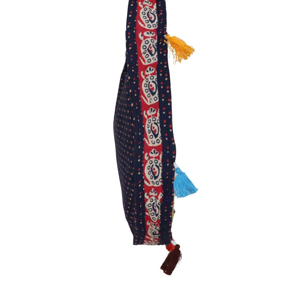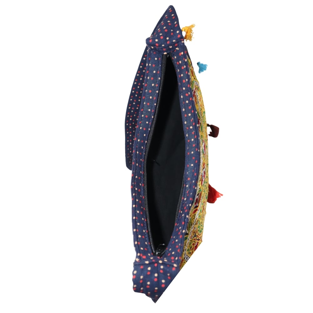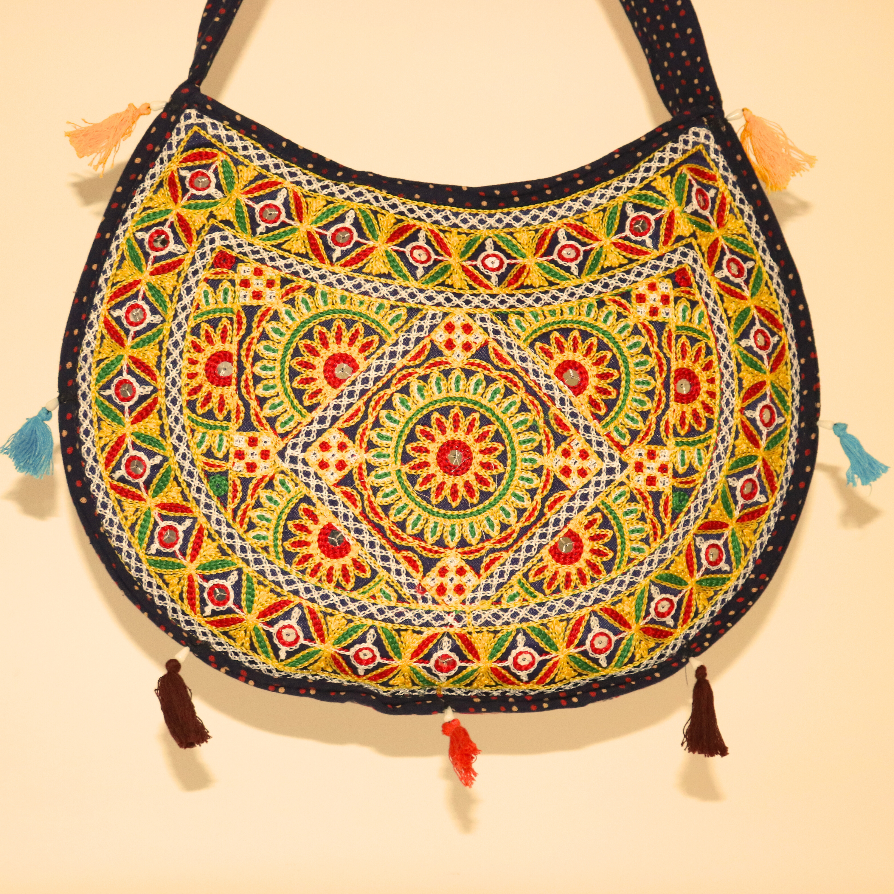 Elevate your everyday style with this vibrant Jaipuri Handmade Embroidered Sling Bag. Crafted from soft, durable cotton, this crescent-shaped crossbody bag features traditional Rajasthani mirror work and intricate multicolor embroidery that reflects the rich heritage of Jaipur. Accented with playful tassels and detailed patterns in red, yellow, green, and blue, this bag is perfect for casual outings, festivals, or as a unique accessory for boho fashion lovers. Its lightweight design and long, comfortable strap make it easy to carry all day, while the secure zippered closure ensures your essentials stay safe. Whether you're heading to the market, meeting friends, or traveling, this ethnic sling bag adds a touch of handmade charm to your look. Ideal for women who appreciate handcrafted, eco-conscious, and artistic fashion. Make a statement with tradition—order your Jaipuri sling bag today and showcase the timeless beauty of Indian craftsmanship!