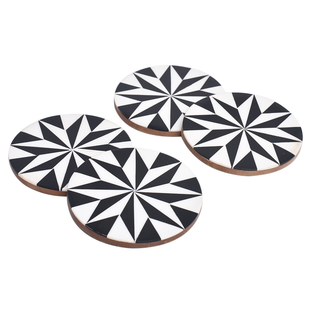 The beautiful black and white Kaleidoscope coasters were handcrafted, creating a fun geometric pattern that is eye-catching, making these great party essentials. It comes as a complete set of four coasters. While you sip your beverage, these coasters will keep your furniture dry. Most glasses and mugs can be placed on these because of their generous size. Because they are made of resin and wood, these coasters are ideal for preventing spills and water rings.