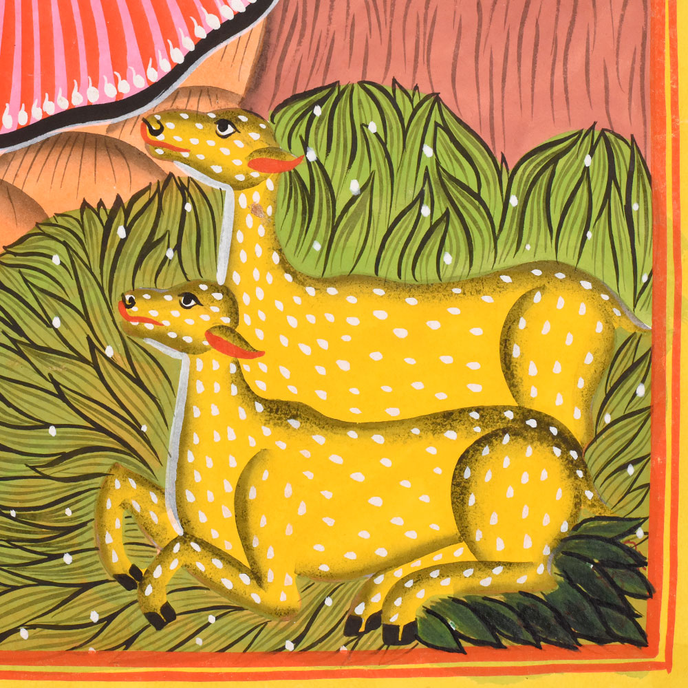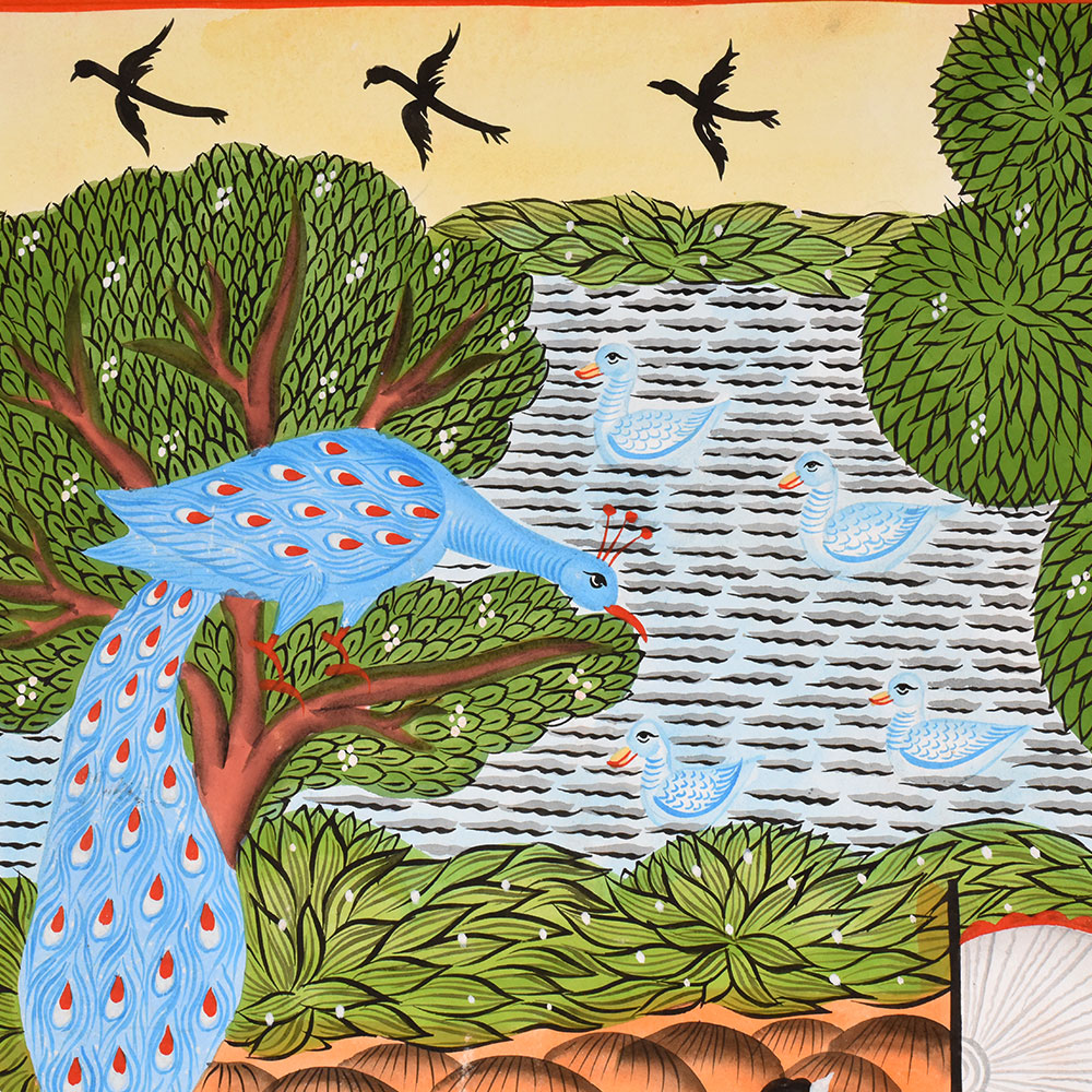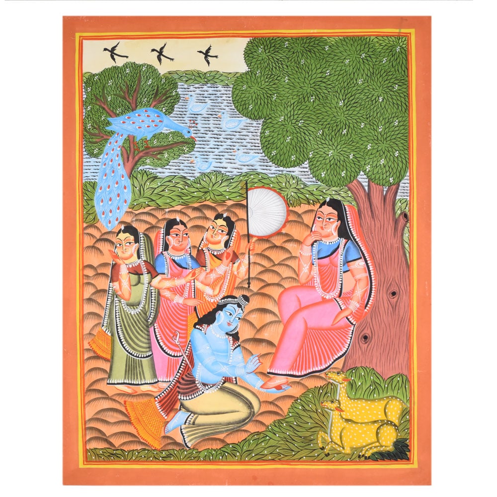 This expressive Kalighat painting on cloth and paper portrays an intimate and emotionally charged scene from Krishnas early life in Vrindavan, rendered in the distinctive narrative style of Kalighat folk art. At the center, young Lord Krishna, identifiable by his blue complexion, is shown kneeling humbly before Mother Yashoda, who sits against a tree with a contemplative yet firm expression. The gesture suggests a moment of discipline or affectionate reproach, capturing the tender humandivine relationship central to Krishnas childhood legends. Surrounding the main figures are gopis, depicted standing close together, reacting animatedly to the scene. Their expressive faces, hand gestures, and attentive postures add emotional depth and storytelling richness. A gopi holding a hand fan subtly emphasizes domestic life and daily village rituals. To the lower right, a pair of stylized deer rest calmly, symbolizing innocence and harmony with nature, while birds flying overhead animate the background and add a sense of openness. The setting is lush and decorative: dense green foliage, patterned trees, and a flowing river painted with rhythmic wave motifs create a vibrant rural landscape. A peacock perched on a tree branchan iconic symbol associated with Krishnaadds both visual charm and symbolic resonance. Bold outlines, flat areas of color, and rhythmic patterning throughout the composition are hallmarks of the Kalighat style, prioritizing narrative clarity over realism. Hand-painted with traditional pigments on cloth backed with paper, this artwork reflects the storytelling tradition of Kalighat patuas, transforming devotional tales into accessible, visually engaging folk art.