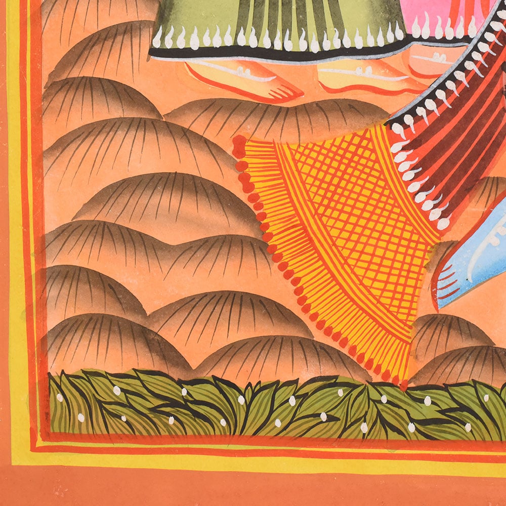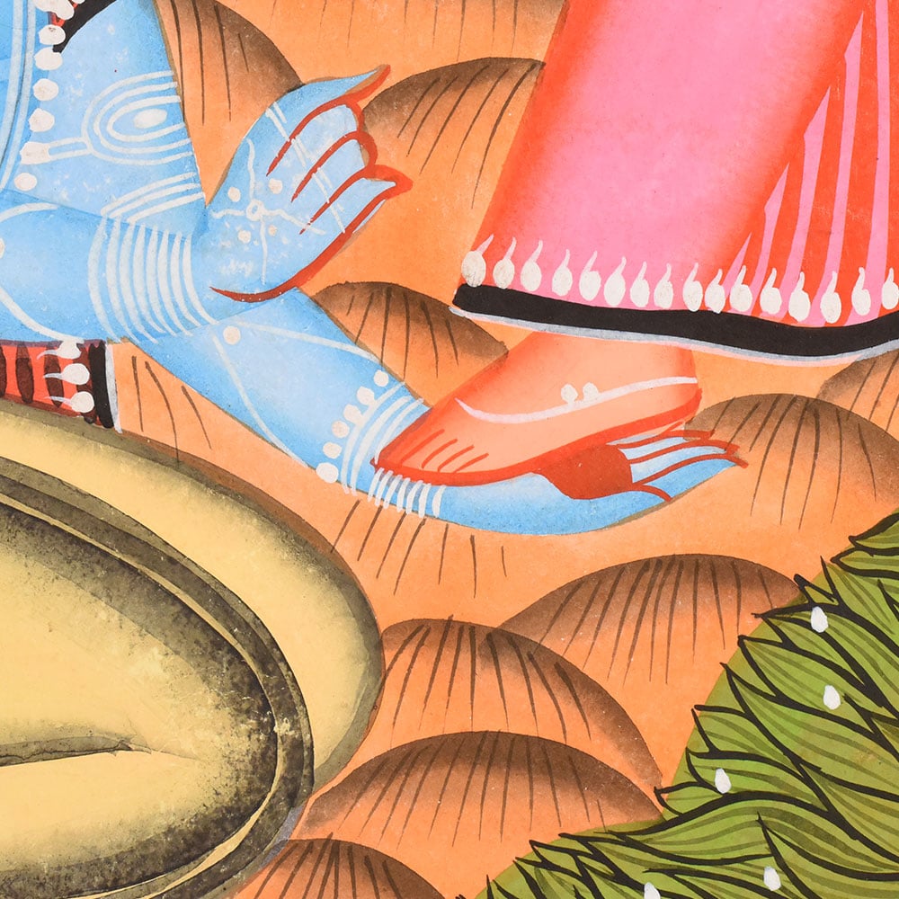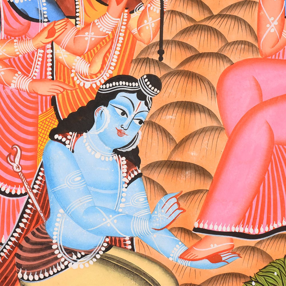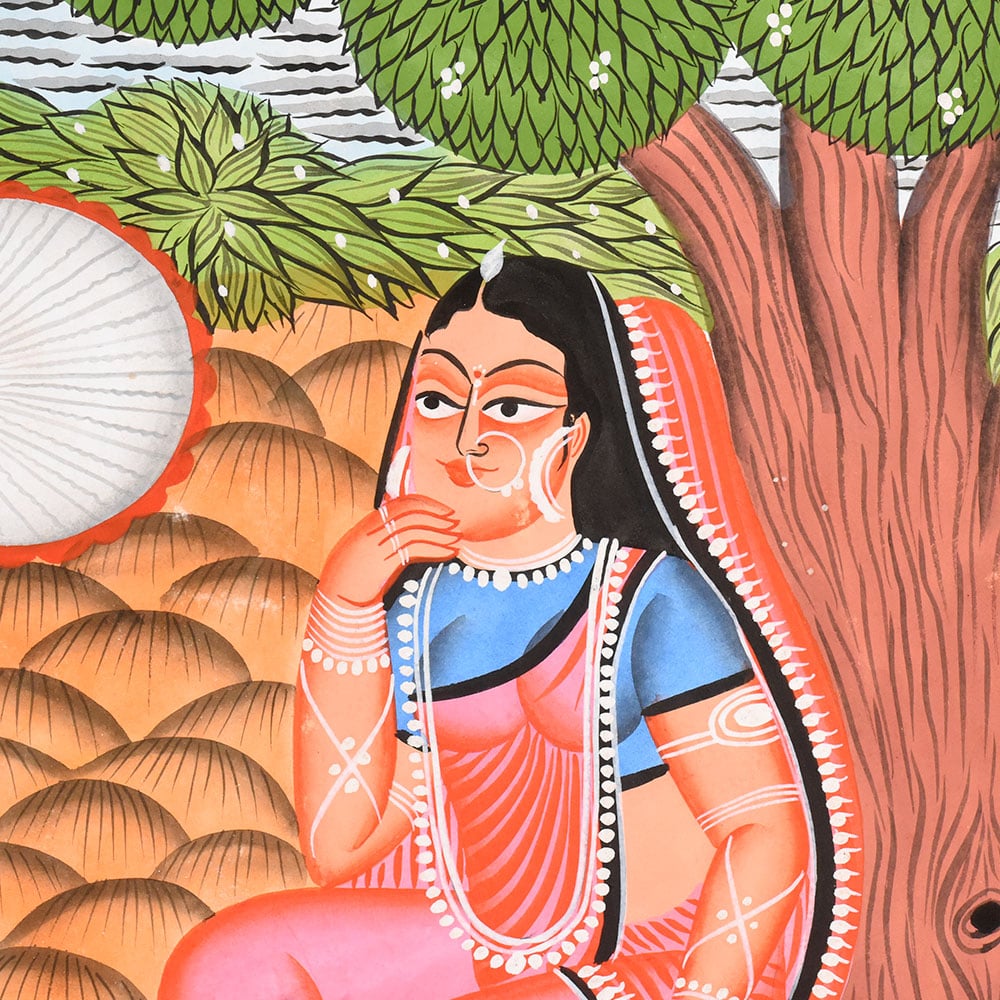 Depicts a tender childhood moment of Lord Krishna with Mother Yashoda Hand-painted on cloth and paper using traditional Kalighat techniques Rich narrative details with expressive figures and village landscape A classic example of Bengali Kalighat storytelling folk artProduct Specification