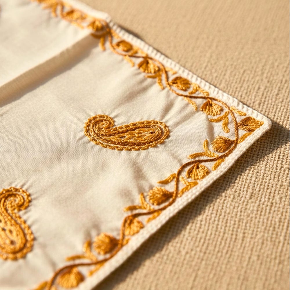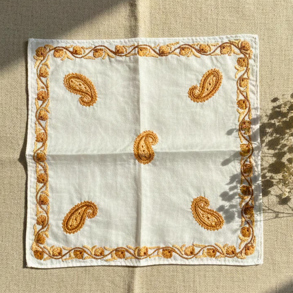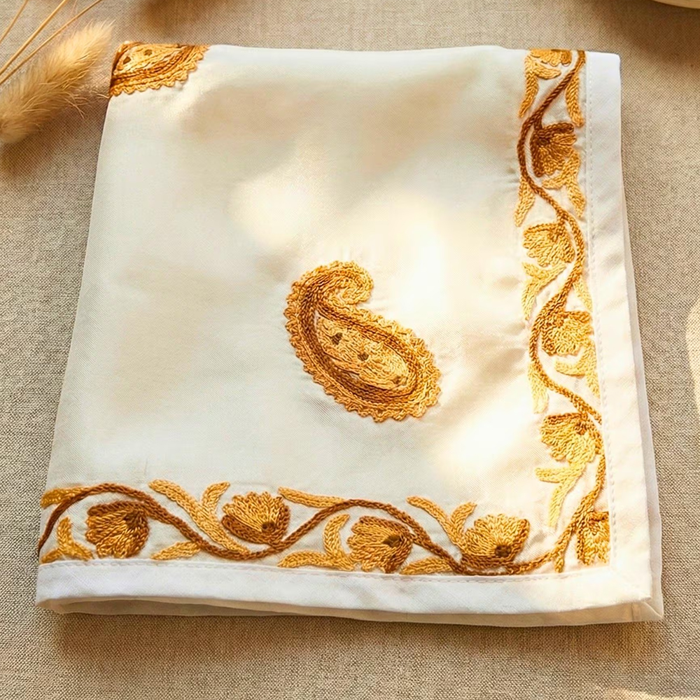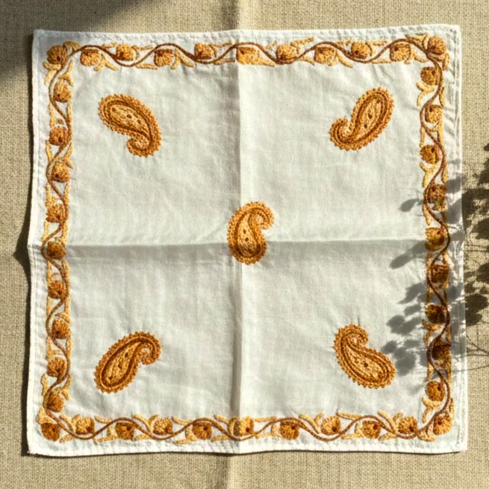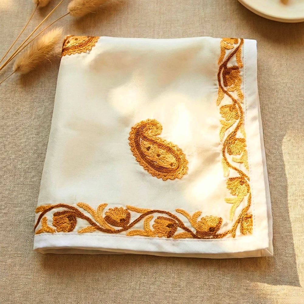 This Kashmiri silk handkerchief is created by artisans who continue generations-old embroidery traditions. Each piece is handcrafted, never mass-produced, celebrating patience, precision, and the enduring beauty of Kashmiri textile artistry.