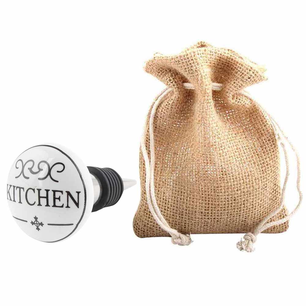 Kitchen Flat Ceramic Wine Bottle Stopper. Zinc Alloy Wine Bottle Stopper with Attractive Jute Bag Packaging.