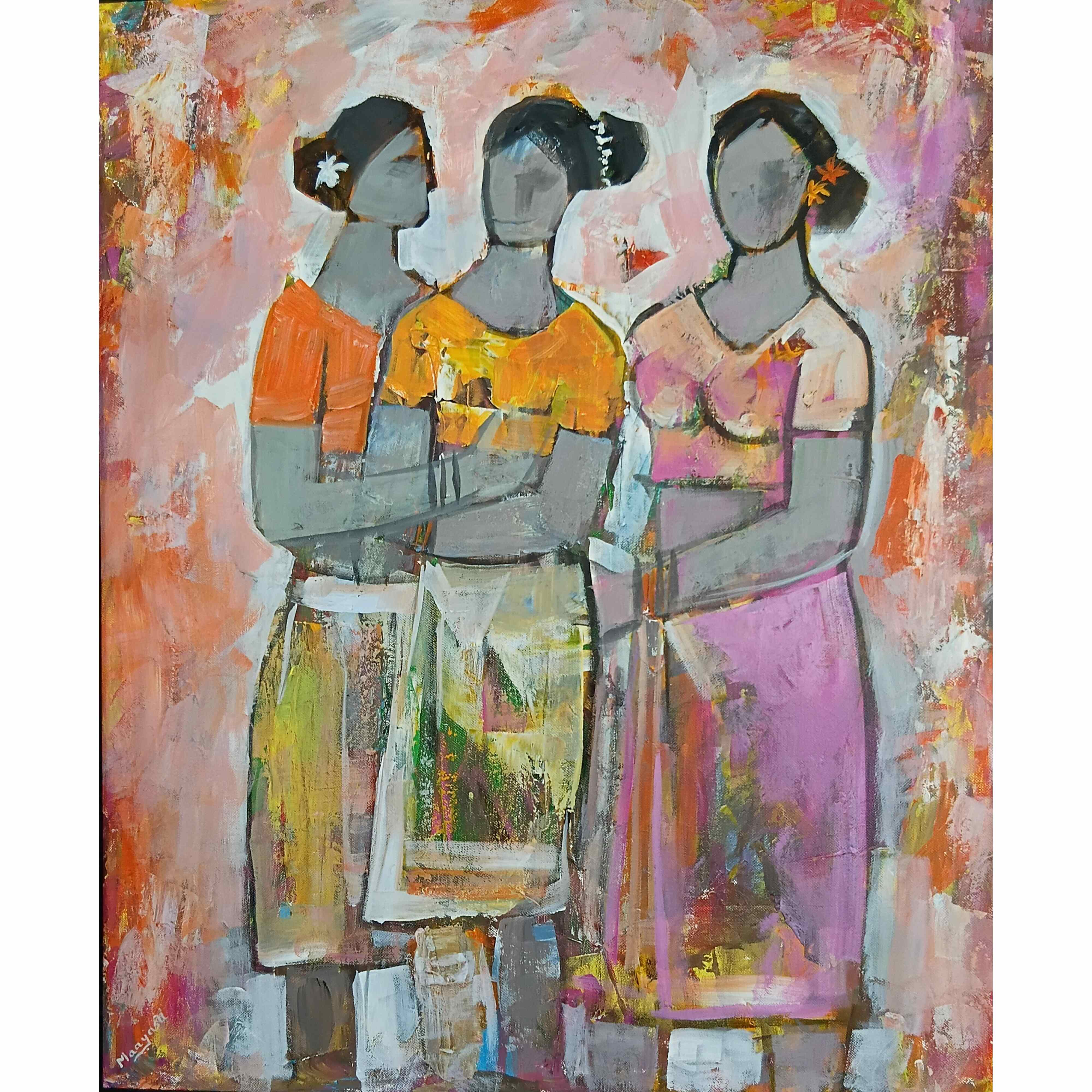 Koottukar Friends Acrylic Canvas Painting by Artist Dr. Maya Subramoni 30 x 24 Inches