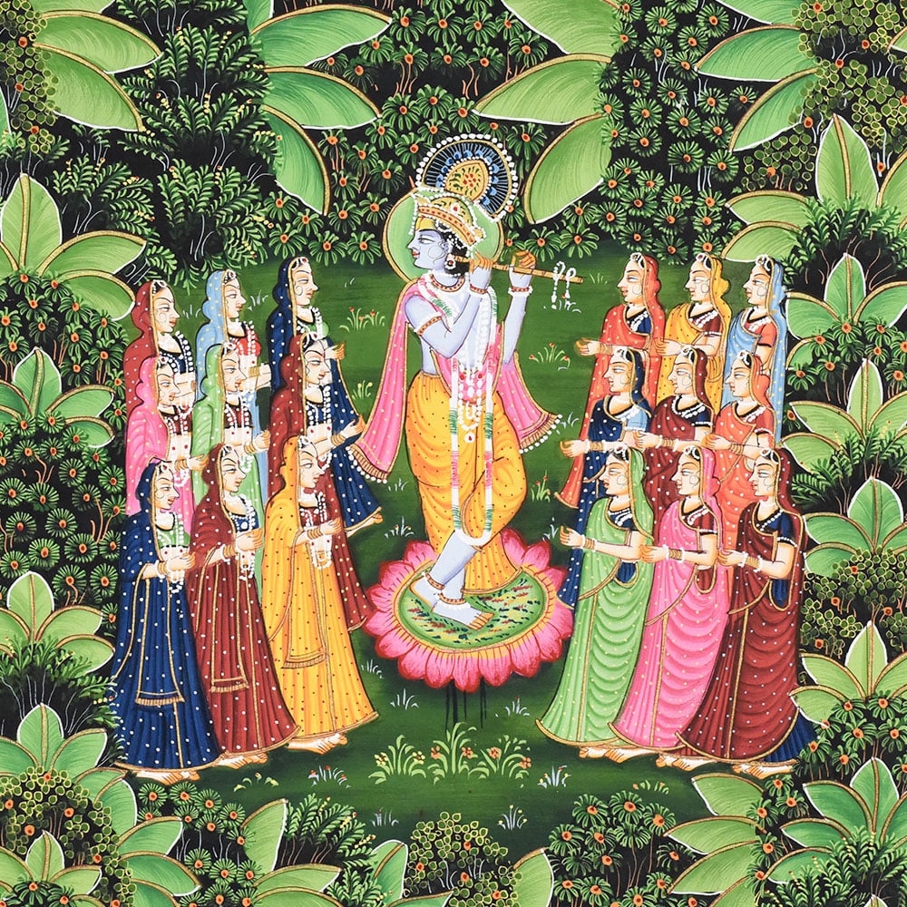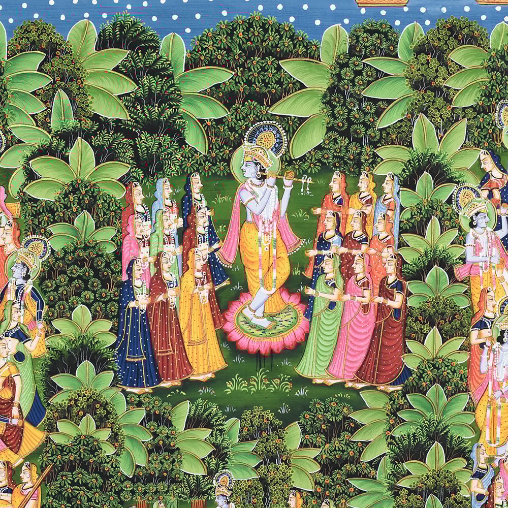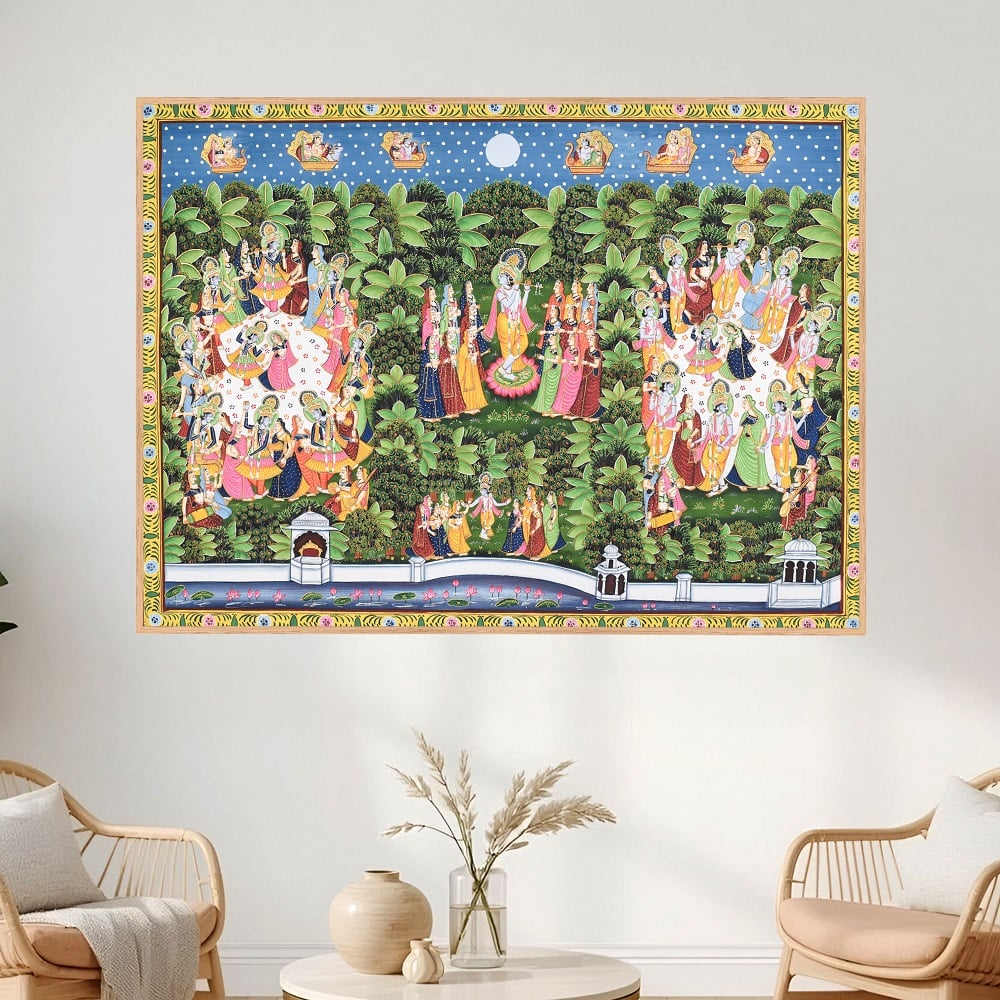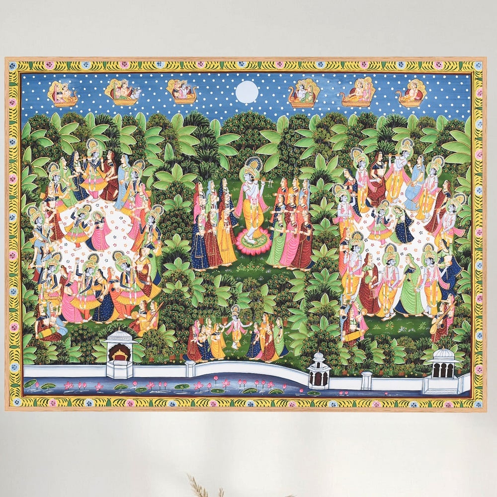 This intricately detailed Pichwai painting portrays the divine Raas Leela of Lord Krishna, one of the most celebrated and symbolically rich themes in Nathdwara temple art traditions. Rooted in devotional storytelling, Pichwai paintings are historically created as sacred backdrops for Shrinathji, illustrating episodes from Krishnas life through ornamental compositions that merge spirituality with artistic precision. At the centre of the composition, Krishna is depicted performing the Raas Leela amidst the gopis in the moonlit groves of Vrindavan. The rhythmic arrangement of figures across the lush garden landscape captures the transcendental joy of divine dance, while the surrounding flora enhances the visual harmony of the scene. The dotted night sky, celestial motifs, and lotus-lined water body further reinforce the spiritual symbolism associated with purity, devotion, and cosmic balance. The paintings ornamental border adds structure to the narrative while maintaining the symmetry that defines traditional Pichwai artistry. Suitable for heritage interiors, spiritual spaces, or curated art displays such as those presented at Modern Art Gallery, this artwork reflects the continuity of temple painting practices into contemporary decorative contexts.