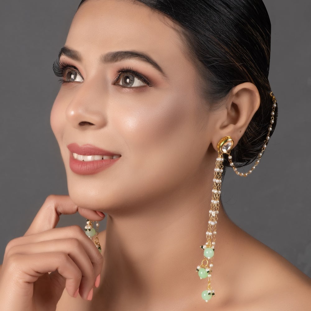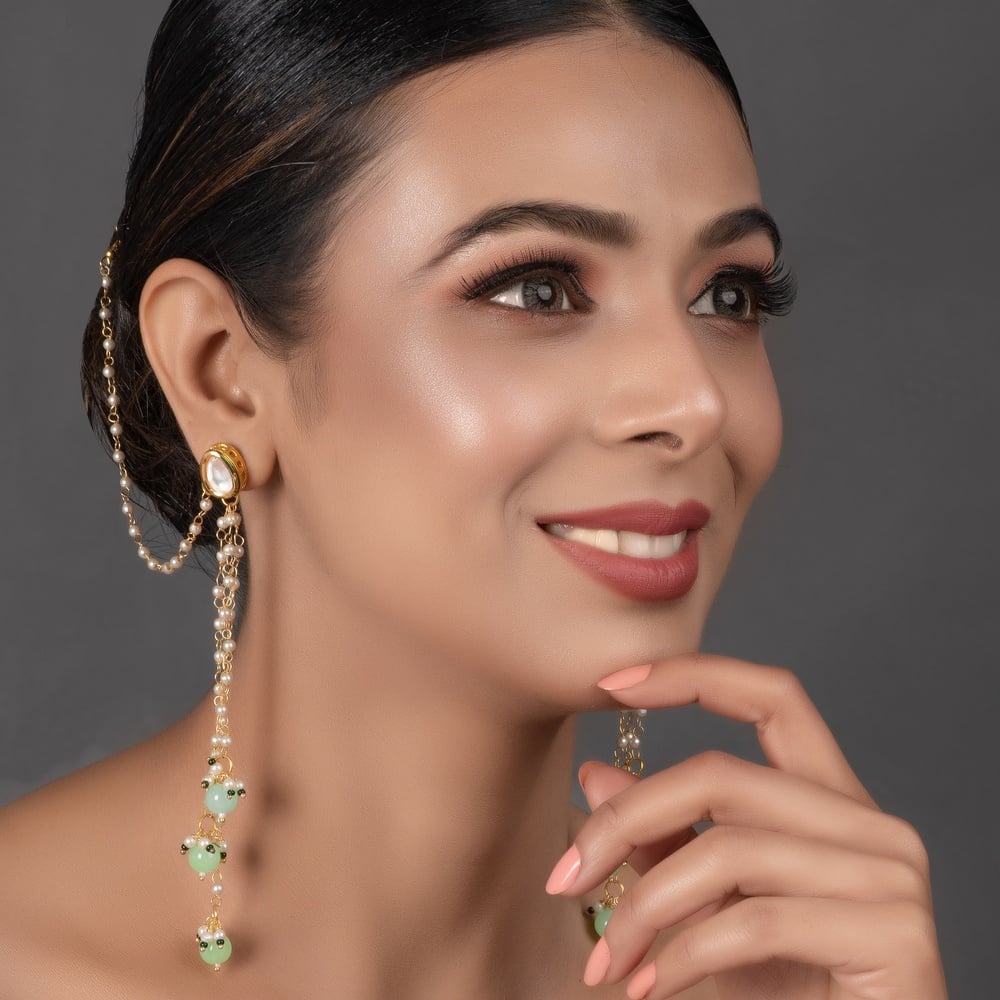 Our ear chain earrings are handcrafted using traditional kundan techniques and embellished with pearls and green beads, ensuring each pair is one-of-a-kind and durable.