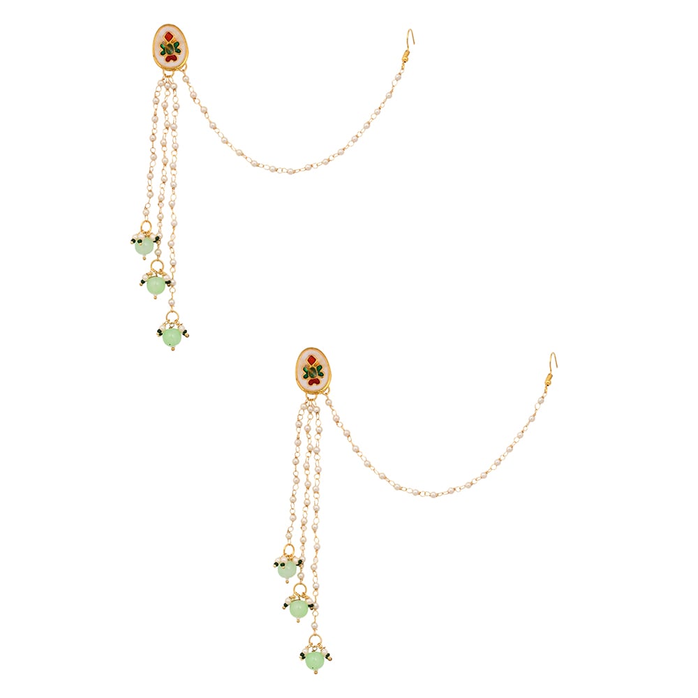 Kundan Green Beads Pearl Ear Chain Earrings Pair