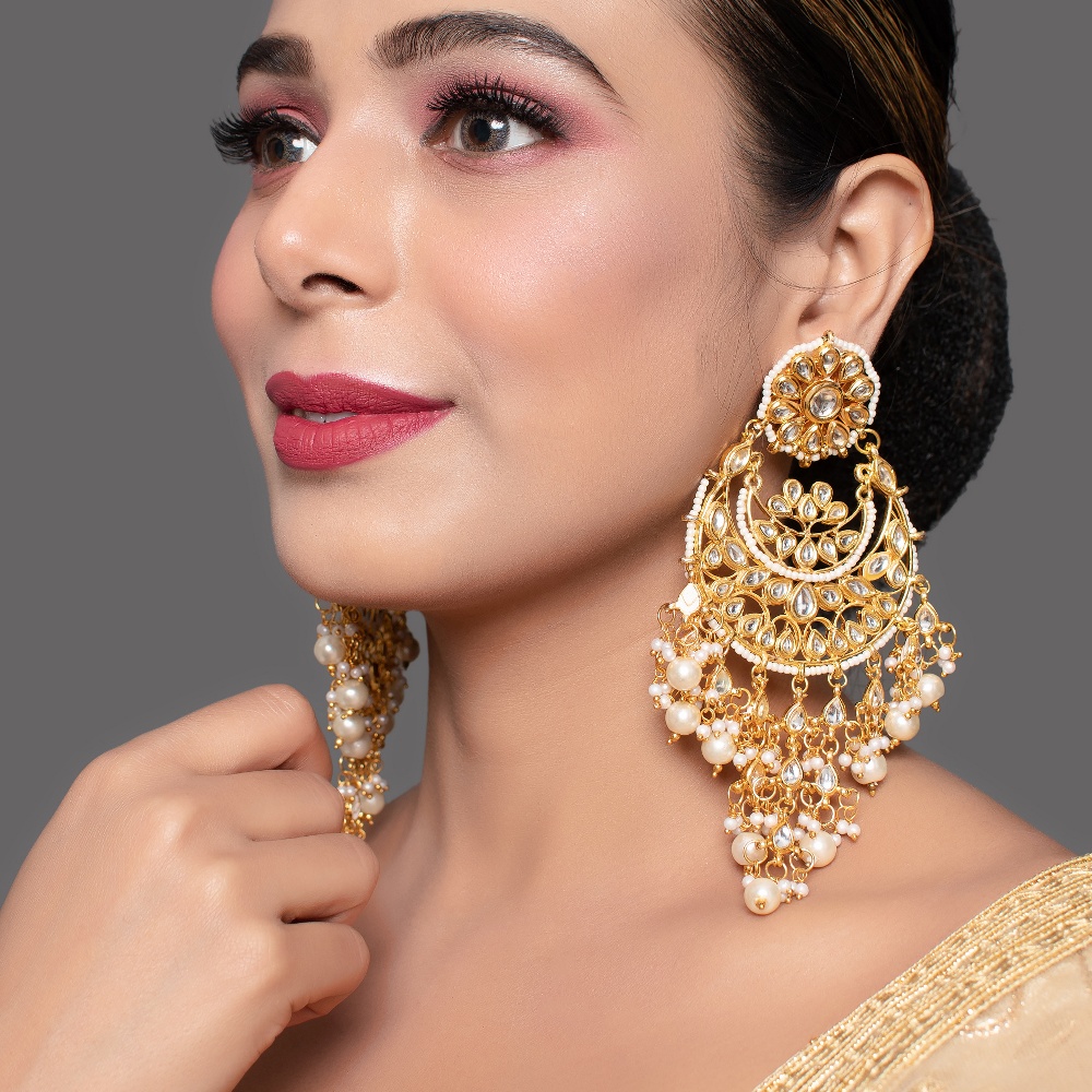 Graceful, traditional, and richly detailed, this kundan pearl chandelier earrings with maang tikka set is crafted for timeless bridal and festive elegance. The set features ornate kundan floral motifs highlighted with reflective stones, layered crescent designs, and cascading pearl drops that add movement and royal charm.