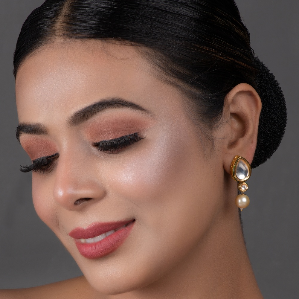 The Kundan Polki Teardrop Pearl Drop Earrings Pair captures the beauty of traditional Indian craftsmanship in a compact, elegant form. Crafted in brass with a warm golden finish, these 1.10-inch earrings feature radiant polki-style kundan stones arranged in a graceful teardrop silhouette. A delicate pearl drop adds softness and refined movement, enhancing the overall balance of shine and subtlety. Designed for timeless appeal, they are perfect for festive, bridal, and elegant everyday styling.