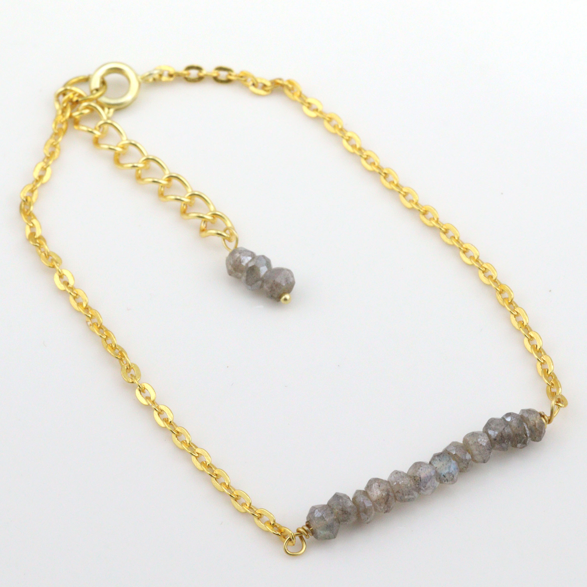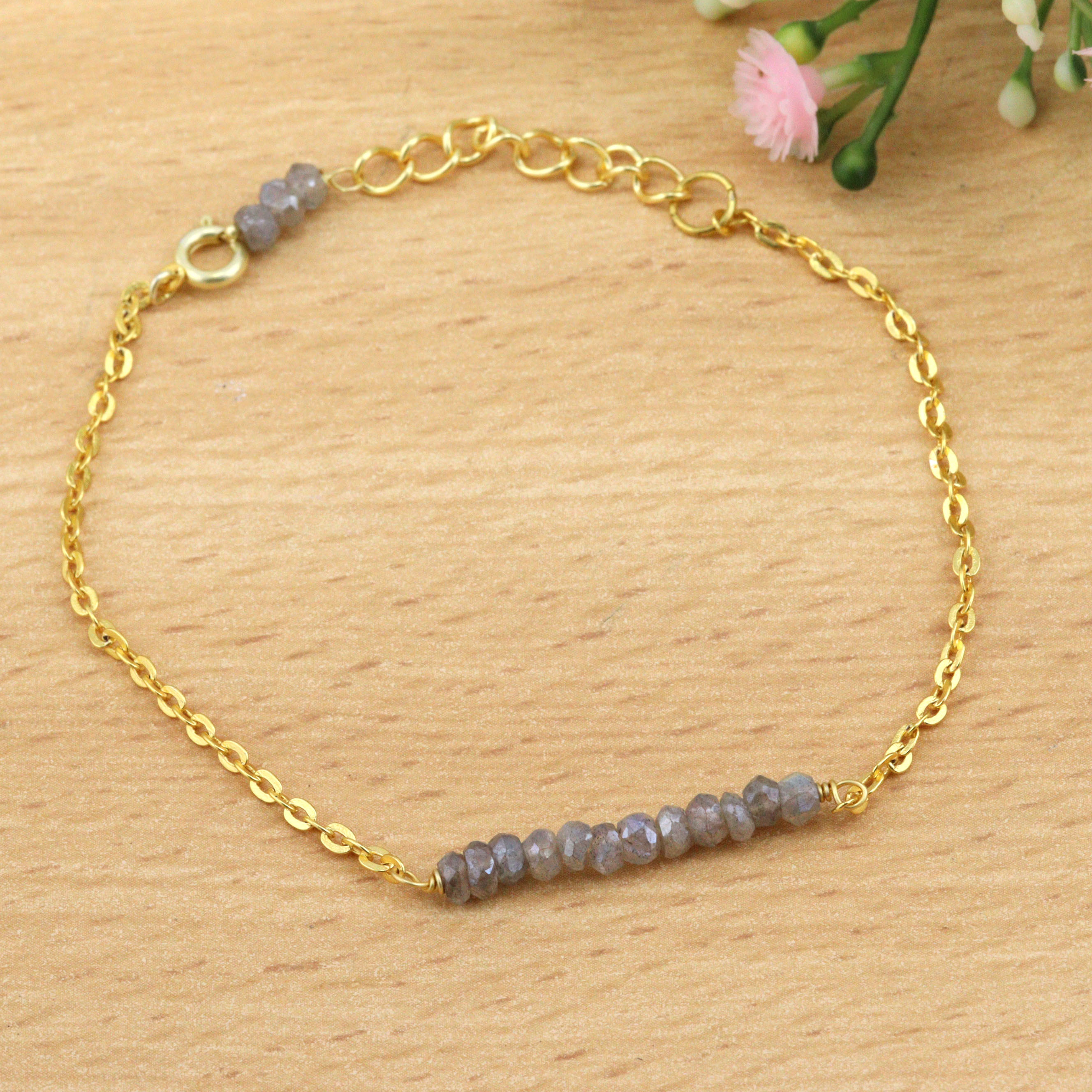 Keep the bracelet dry and store it separately to protect the labradorite’s natural sheen and the 22k gold plating.