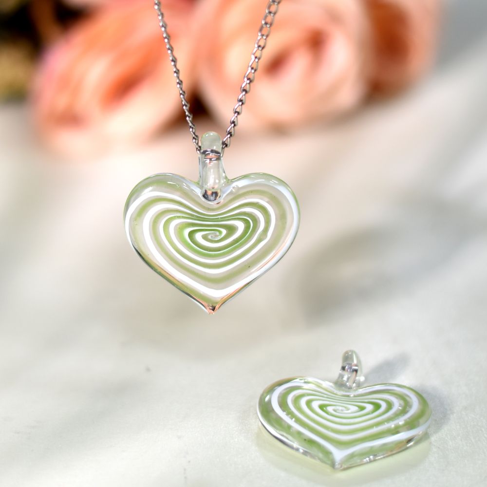 Celebrate love and artistry with this Lampwork Green Spiral Heart Glass Pendant, a handcrafted symbol of emotion and elegance. Expertly shaped through the traditional lampwork technique, molten glass is skillfully molded into a heart form, layered with swirling green tones that evoke freshness, harmony, and vitality. Its intricate spiral pattern and luminous finish make it a meaningful keepsake — perfect for gifting or adding a touch of handcrafted beauty to your favorite necklace.
