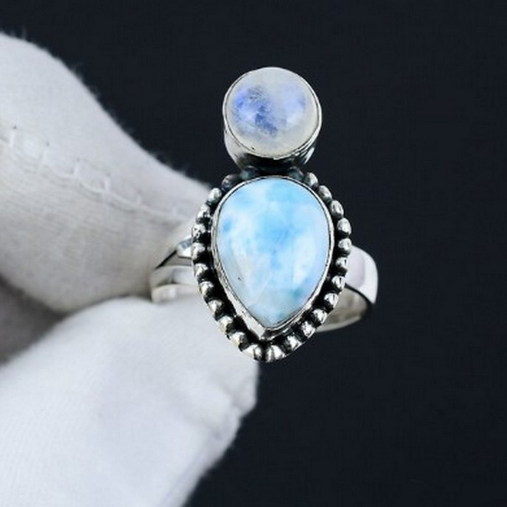 Larimar Moonstone Boho 925 Sterling Silver Ring Handmade Boho Jewelry