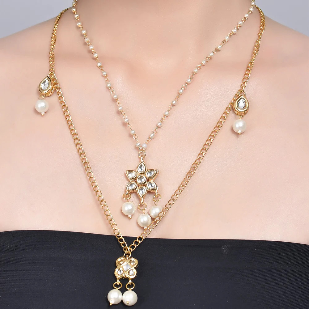 The Layered Pearl Mirror Star Pendant Necklace Set for Women blends delicate layering with celestial-inspired design. Crafted in polished golden brass, the necklace features a radiant star-shaped mirror pendant surrounded by soft pearl accents. The layered structure adds graceful depth while keeping the overall silhouette refined and lightweight. With its elegant 9.5-inch length, this handcrafted piece offers a sophisticated balance of festive charm and modern styling.