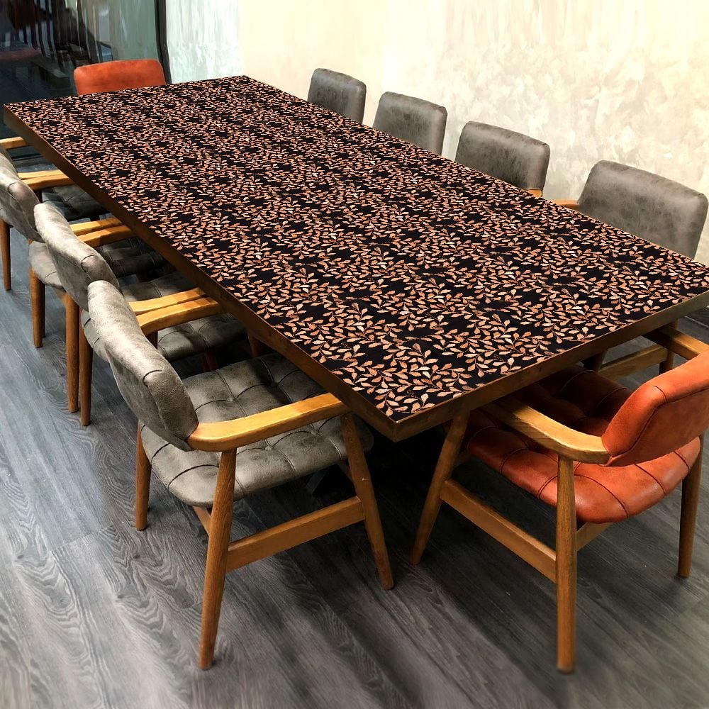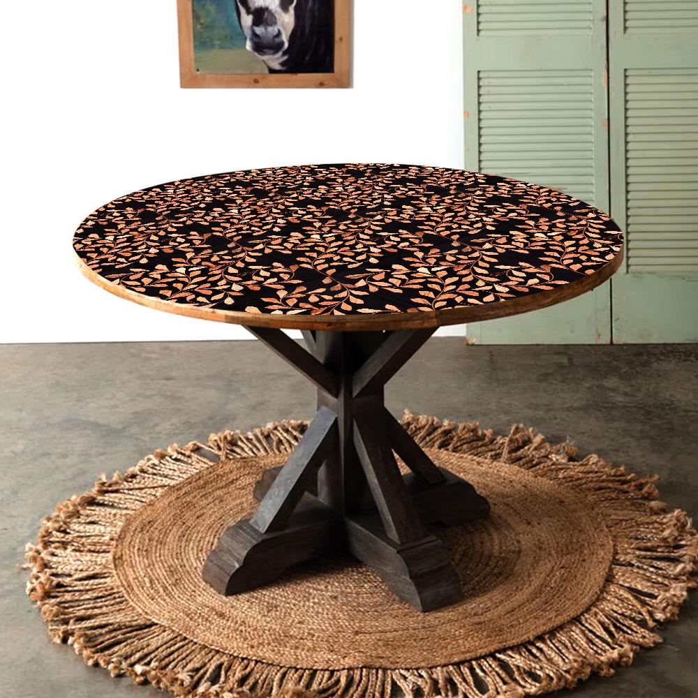 Introducing our exquisite handmade table top, a true masterpiece handcrafted by highly skilled Indian artisans. This captivating piece is meticulously created using a blend of wood, acrylic, and resin, resulting in a stunning amalgamation of elegance and durability. The table top features a sleek black background that beautifully contrasts with the intricate engravings of light brown-coloured leaf patterns, adding a touch of nature's grace. Designed to enhance the ambiance of any space, this versatile table top serves as a remarkable centerpiece for your dining table at home, creating an inviting and artistic atmosphere. Additionally, it effortlessly elevates the decor of coffee tables in restaurants or hotels, offering a visual treat for guests. Crafted with the utmost precision and attention to detail, this high-quality table top ensures long-lasting performance, surpassing other alternatives in durability. With two distinct options available, circular and rectangular, you can choose the perfect shape to complement your specific space requirements. Furthermore, this extraordinary table top serves as a thoughtful gift for your loved ones during special occasions or festive celebrations. Whether adorning a console table, a side table, or a kitchen table, this exceptional creation promises to captivate hearts with its exquisite design and timeless appeal.