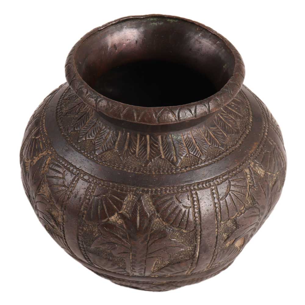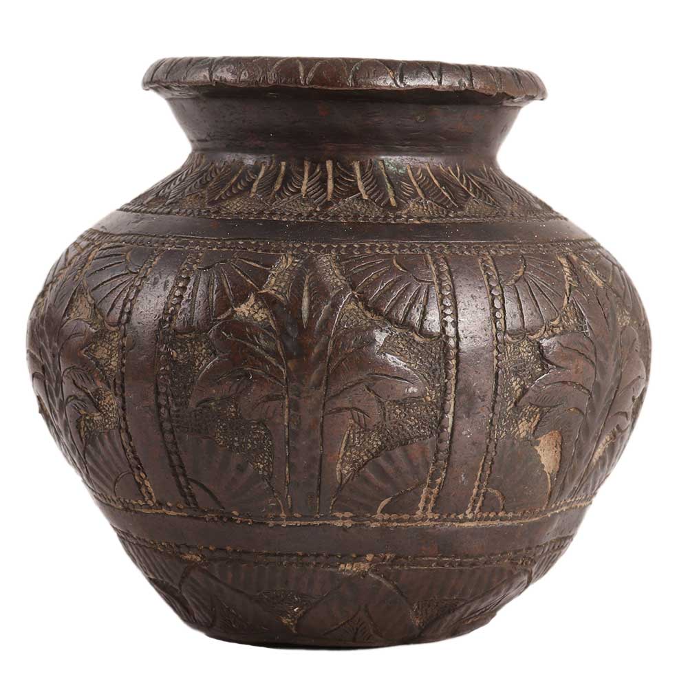 The pot is handcrafted from brass by skilled Indian artisans. The engraving on this pot is extremely fine and detailed, as well as very well done. It is elegantly engraved with flowers, leaves, and other traditional motifs and can be used for gifting, decoration, and other purposes. It comes in a dark brown finish.