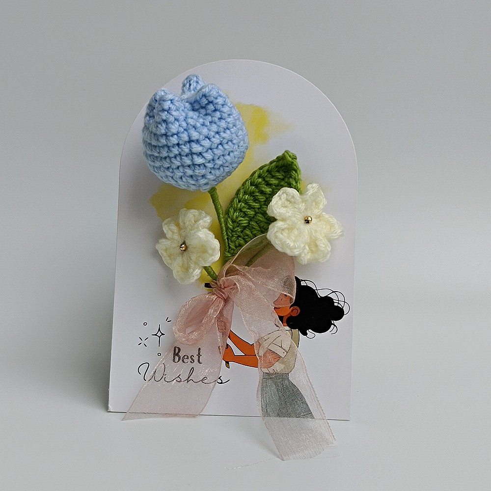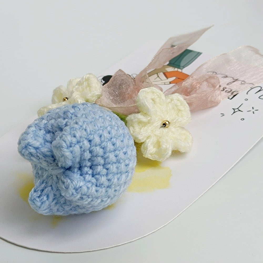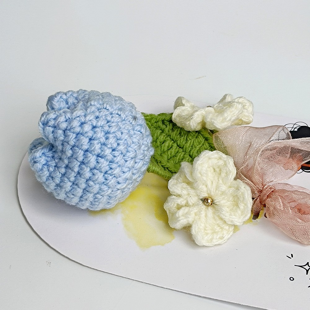Keep your blue crochet piece away from moisture and direct sun to prevent dust and fading. Dust gently with a soft brush or a hairdryer on cool, and reshape stems carefully if needed.