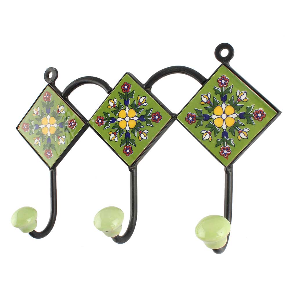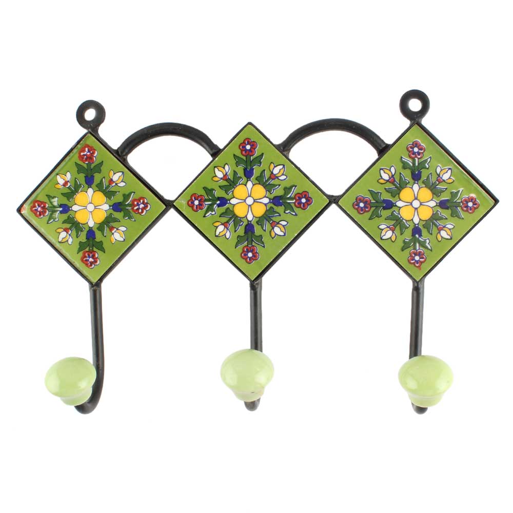 Light Forest Green Ceramic Floral Tile Hook. When Put on Wall or Cabinet It is An Art in Itself. The Metal Part of this Hook is Black Powder Coated.