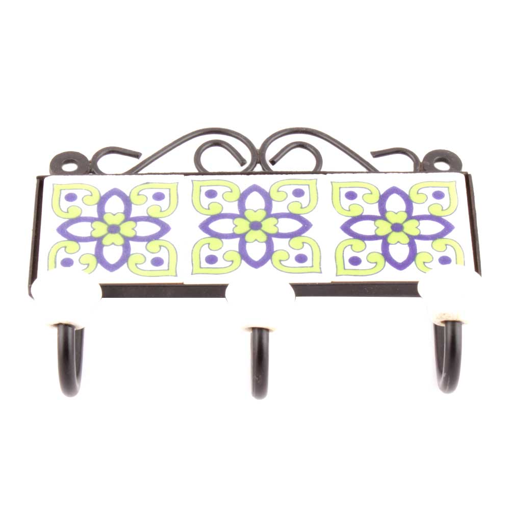 Light Green And Navy Blue Floral Tiles Hook. When Put on Wall or Cabinet it is an Art in itself. The Metal Part of this Hook is Black Powder Coated.