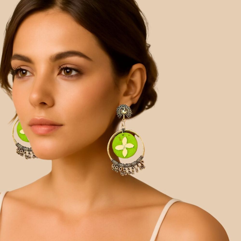 The Light Green Oxidized Jhumka Bali Earrings offer a refreshing take on a timeless Indian jewellery silhouette. Crafted on a fabric base, the gentle light green tone brings calm elegance, beautifully balanced by oxidized detailing that adds vintage depth. The Bali hoop paired with a traditional jhumka creates graceful movement without heaviness. Designed for comfort and cultural charm, these earrings blend everyday wearability with festive appeal.