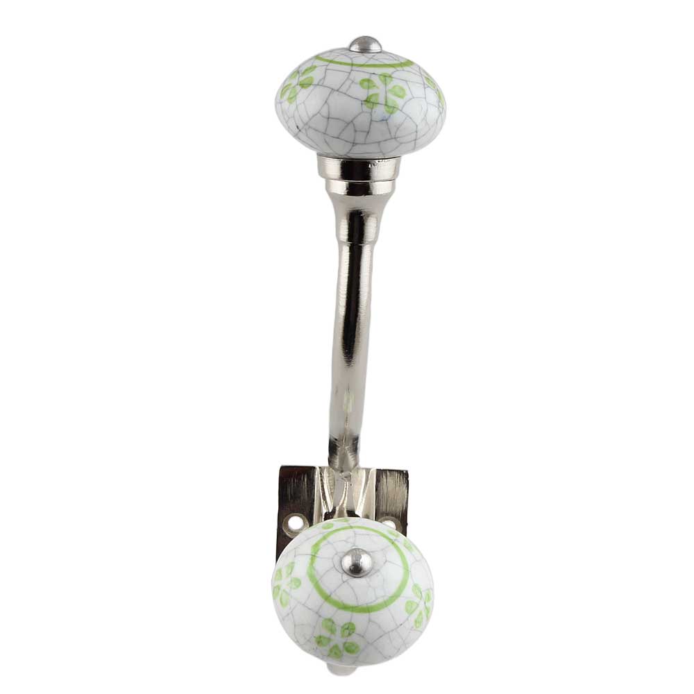 Infuse personality into your space with the Lime Floral Crackle Ceramic Silver Iron Hook. This handcrafted hook features a delicate floral pattern in lime green, crackle-glazed onto a ceramic round top, and mounted on a sturdy silver-toned iron base. Designed to add both charm and utility, it brings a cheerful burst of color and artisanal flair to any wall while offering a strong, practical solution for everyday hanging needs.