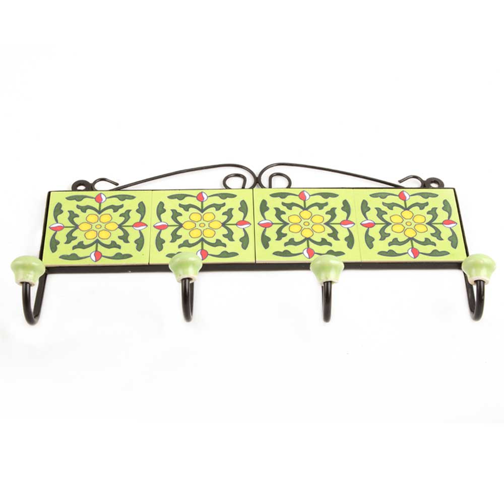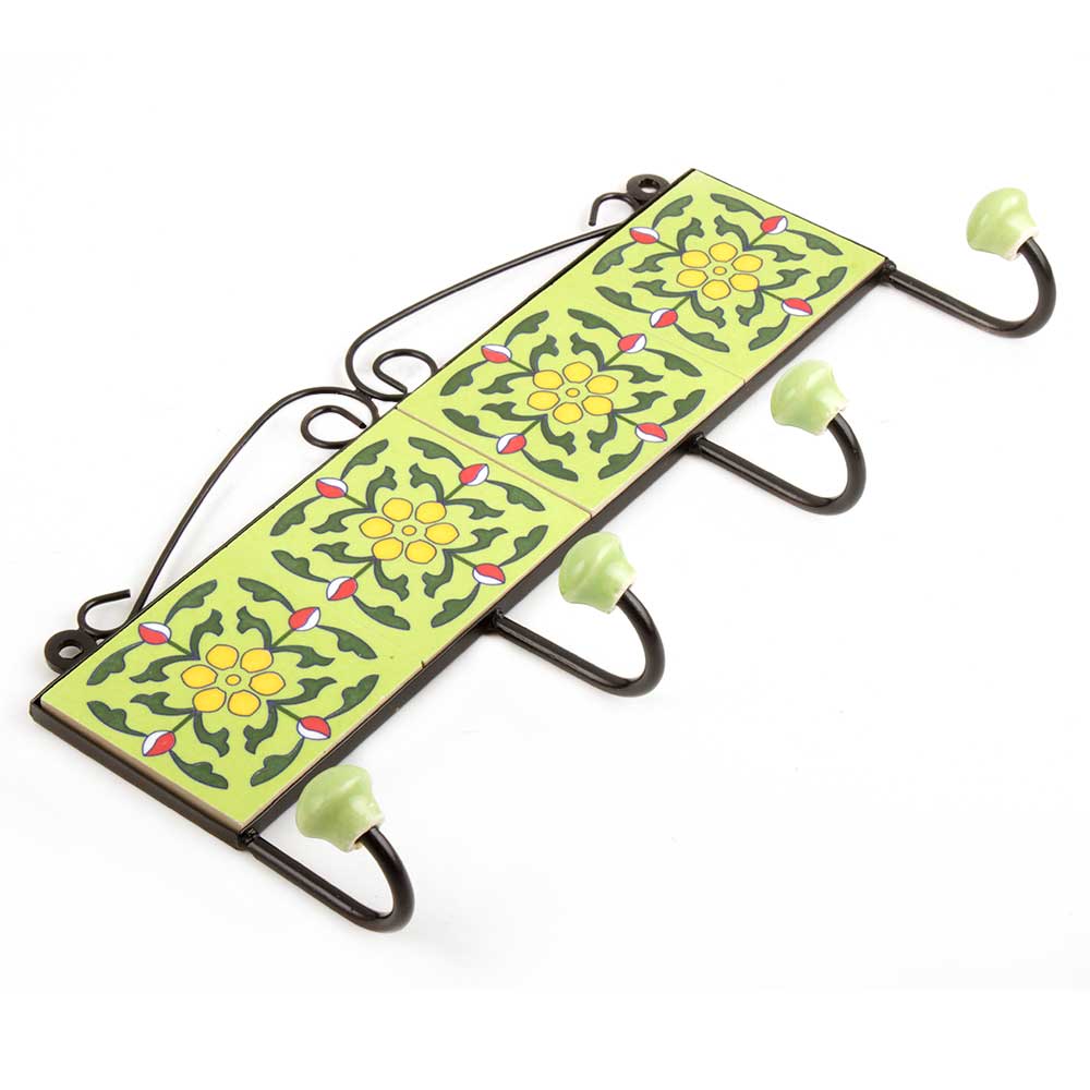 Lime Green Yellow Floral Tiles Hooks .When put on wall or cabinet it is an art in itself. The metal part of this hook is black powder coated.
