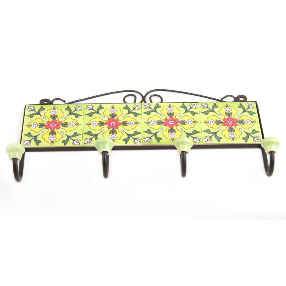 Lime Green Yellow Leaf Tiles Hooks .When put on wall or cabinet it is an art in itself. The metal part of this hook is black powder coated.