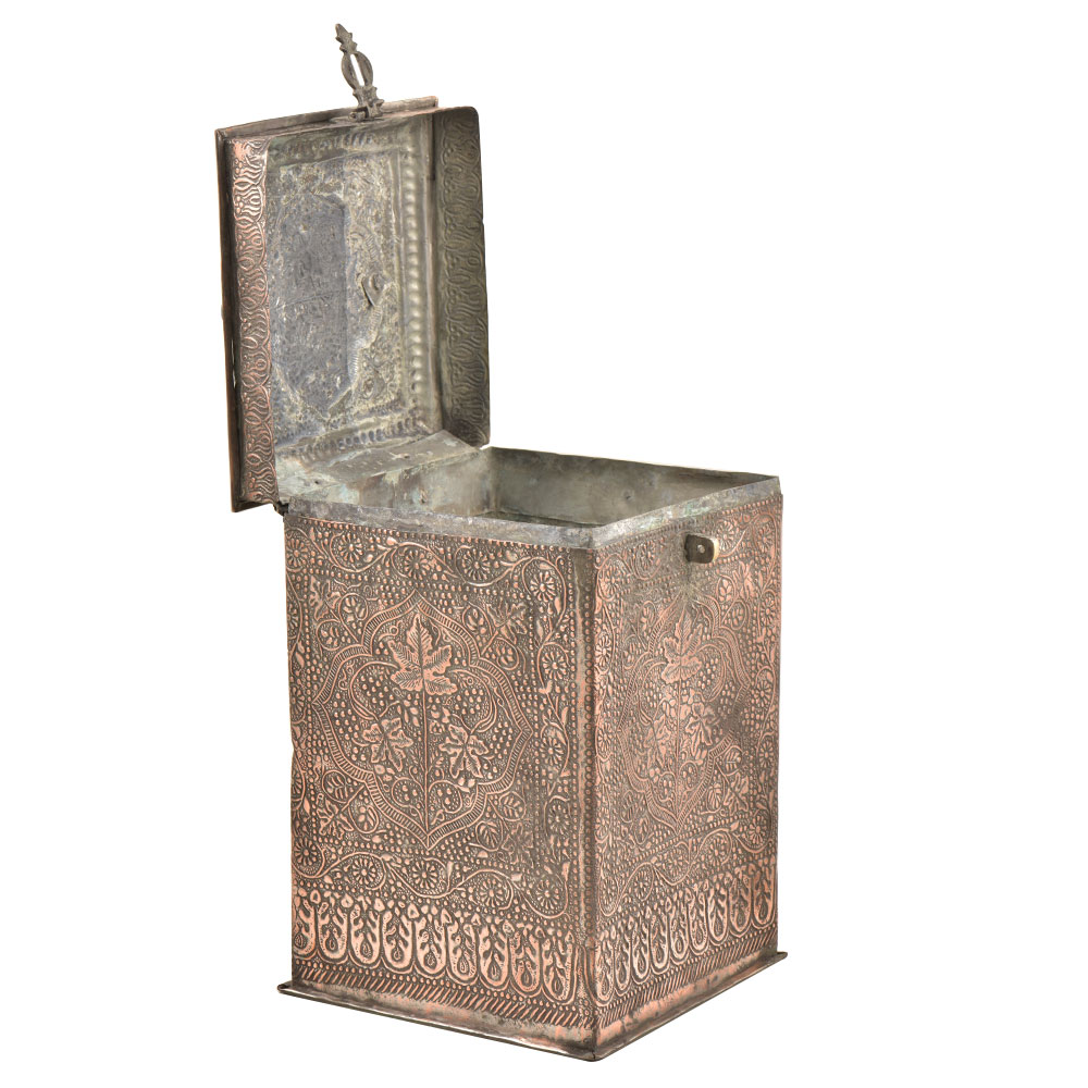This Copper storage box or canister has a simple, classic design made by expert craftsmen on india will add a touch of class to any set of decor due to its elaborate repousse design on the box as well as the lid. It also has a latch that keeps the stuff safe and secure.