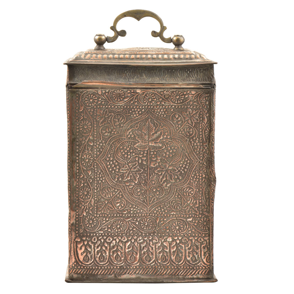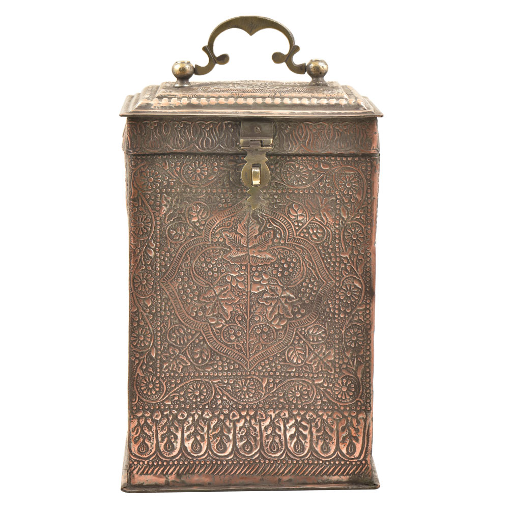 • Long Copper Repousse Floral Canister With Latch And Handle