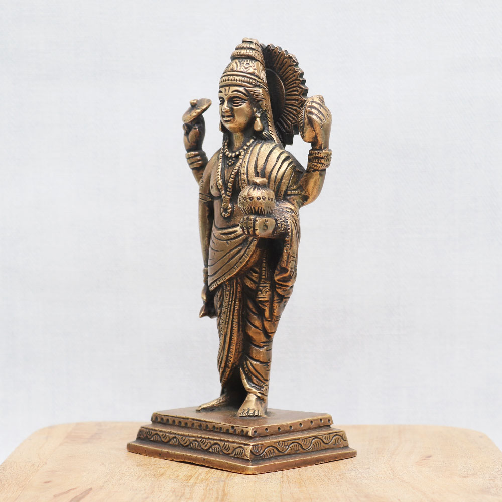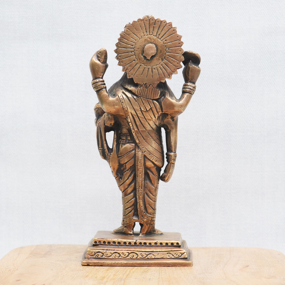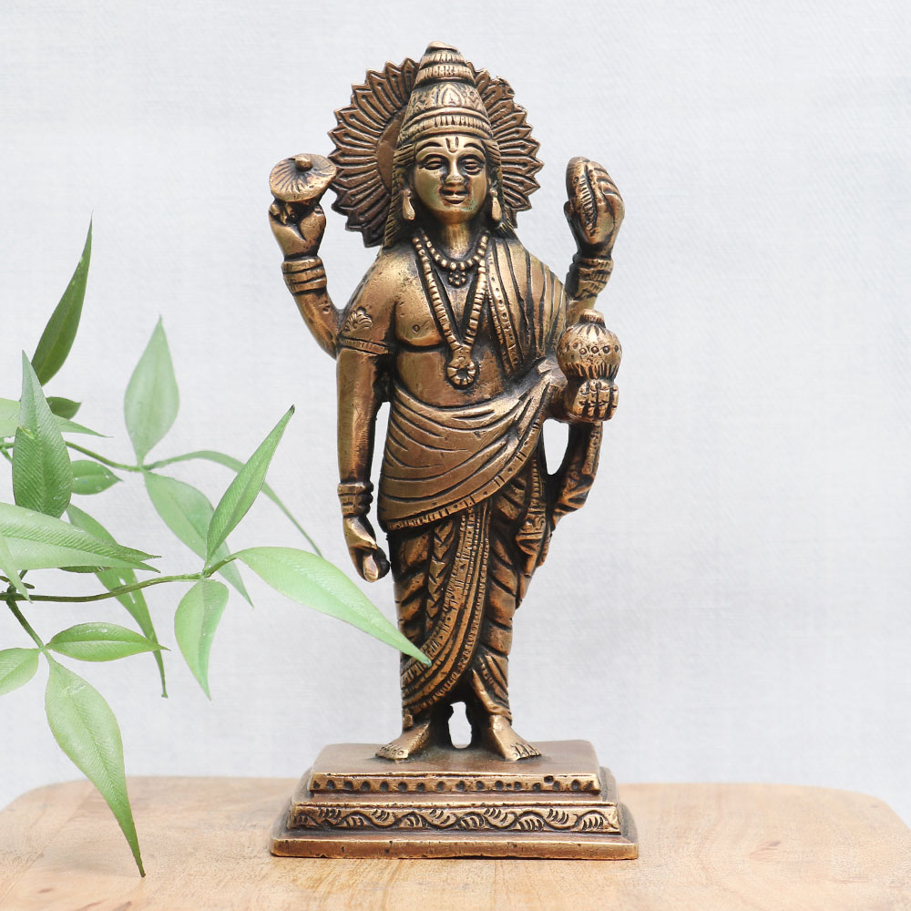 This Lord Dhanvantri Bronze Statue is an extraordinary embodiment of Lord Vishnu's avatar, meticulously crafted by highly skilled and experienced Indian artisans. This masterpiece is intricately handcrafted using the finest quality bronze, ensuring an exquisite finish that exudes an antique charm. Ideal for adorning your home, office, restaurant, or hotel temple, this divine statue serves as a focal point for worship. Its intricate details and divine presence create an ambiance of spirituality and tranquillity. It also makes a remarkable addition to your vintage collection, lending an air of elegance and sophistication to any museum or exhibition. Beyond its spiritual significance, this stunning statue serves as a stunning decoration, enhancing the aesthetic appeal of any space. It can be an auspicious gift for your loved ones on special occasions or festive celebrations, imparting blessings and positive energy to their lives. Discover the divine essence of Hindu god statues online and elevate your reverence with this Lord Dhanvantri bronze idol, a true god showpiece that embodies divine grace and beauty.