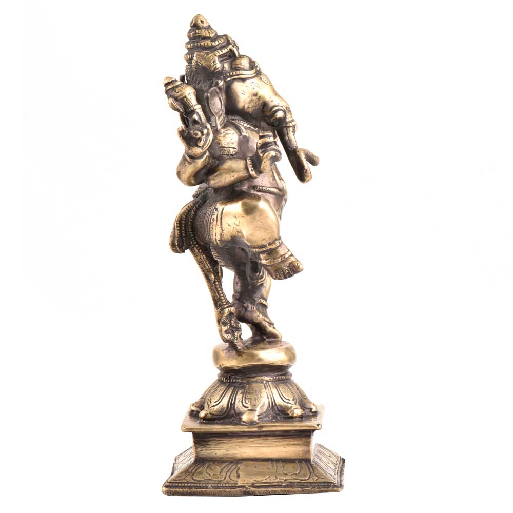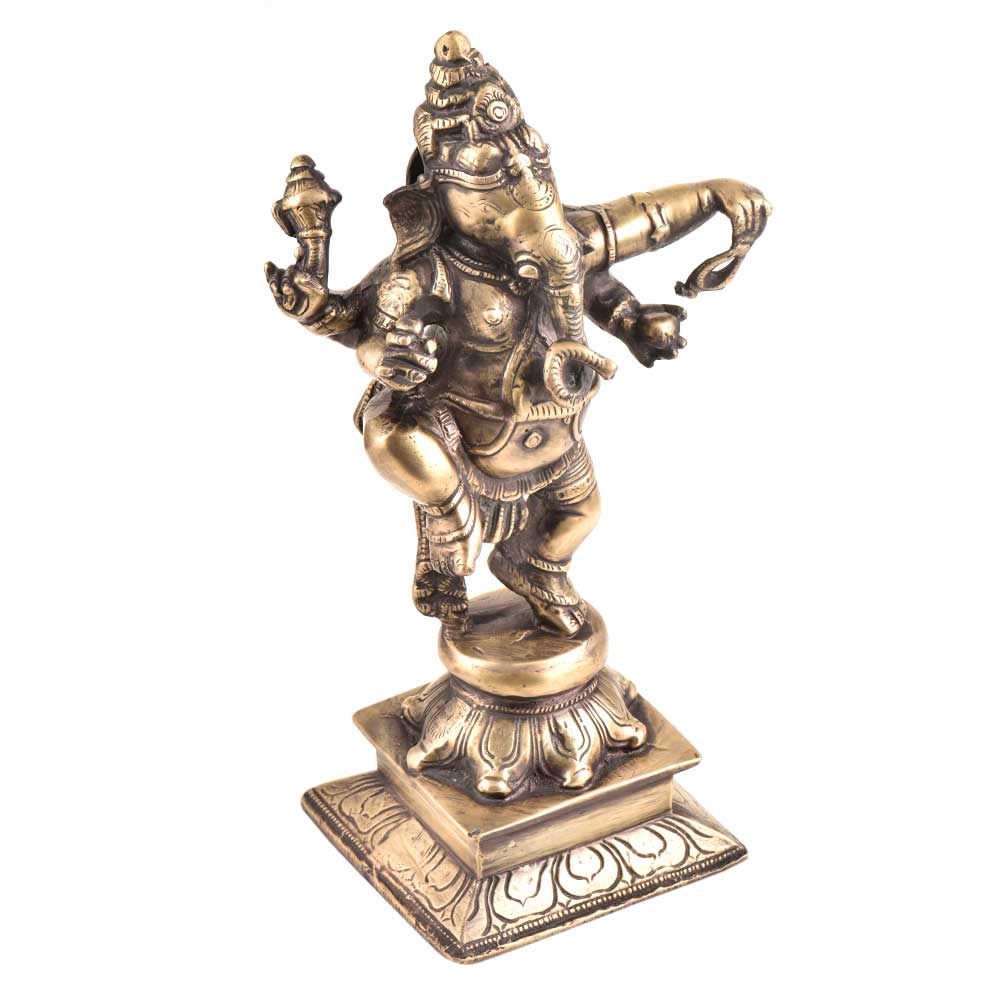 Finely engraved figurine of lord ganesha dancing is handmade by the skilled craftsmen of India. This figurine is made of brass and it has very fine detailings which makes it more pretty. It can be used for worshipping, decoration or for gifting.