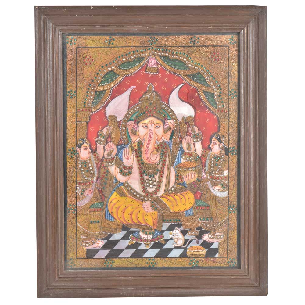 Lord Ganesha His Two Wives Tanjore Painting With Frame
