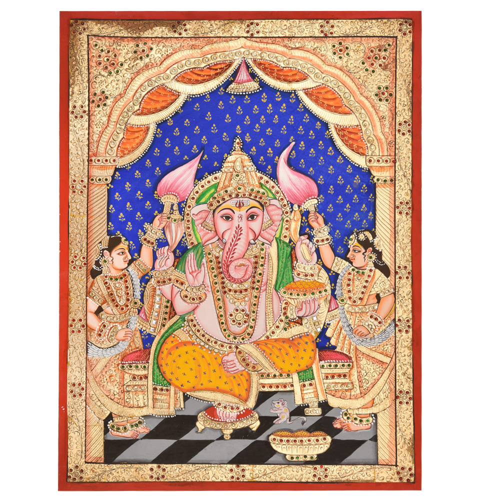 Lord Ganesha with his Two Wives Traditional Tanjore Painting. Made on board.