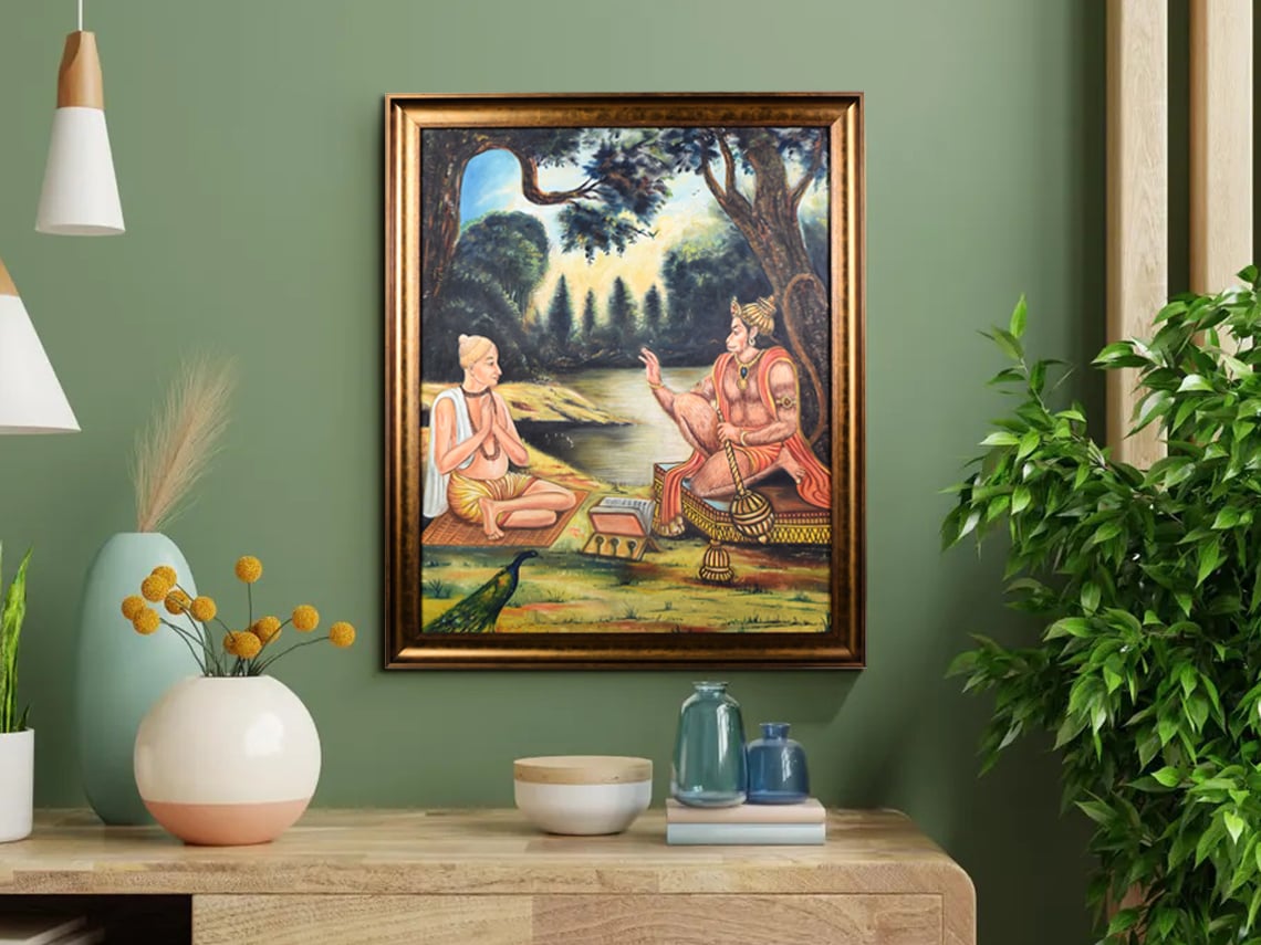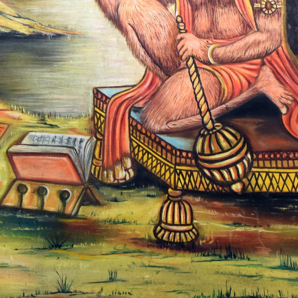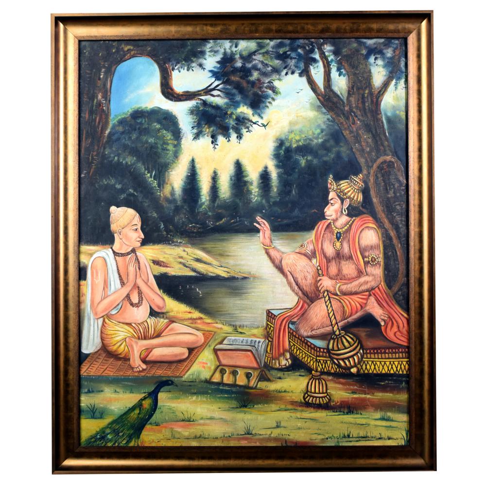 - Breathtaking vintage canvas painting of Lord Hanuman with the renowned poet Tulsidas