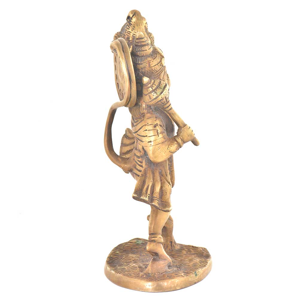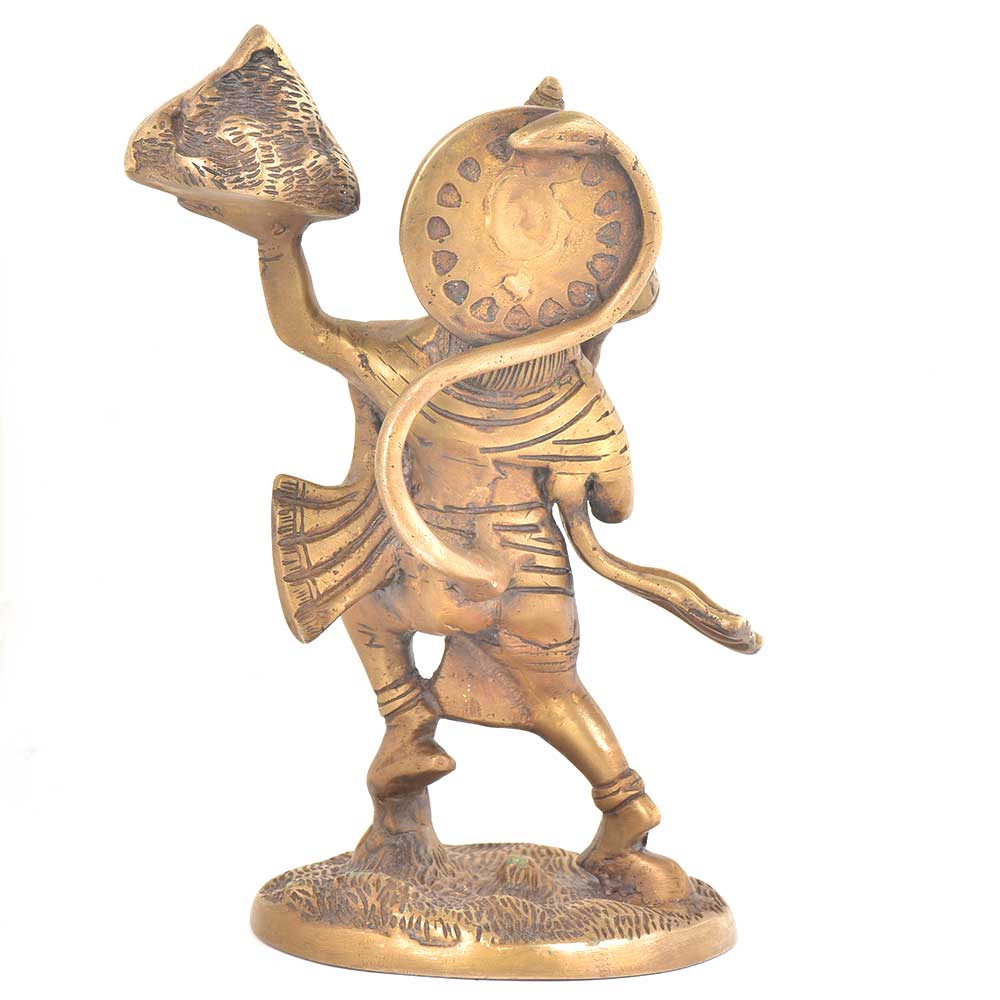 Lord Hanuman was an ardent devotee of lord Rama and an incarnation of Lord Shiva . This brass statue depicts lord hanuman holding the mountain of herb in one hand ( sanjeevani booti) to save the life of lord ram's brother lakshman.