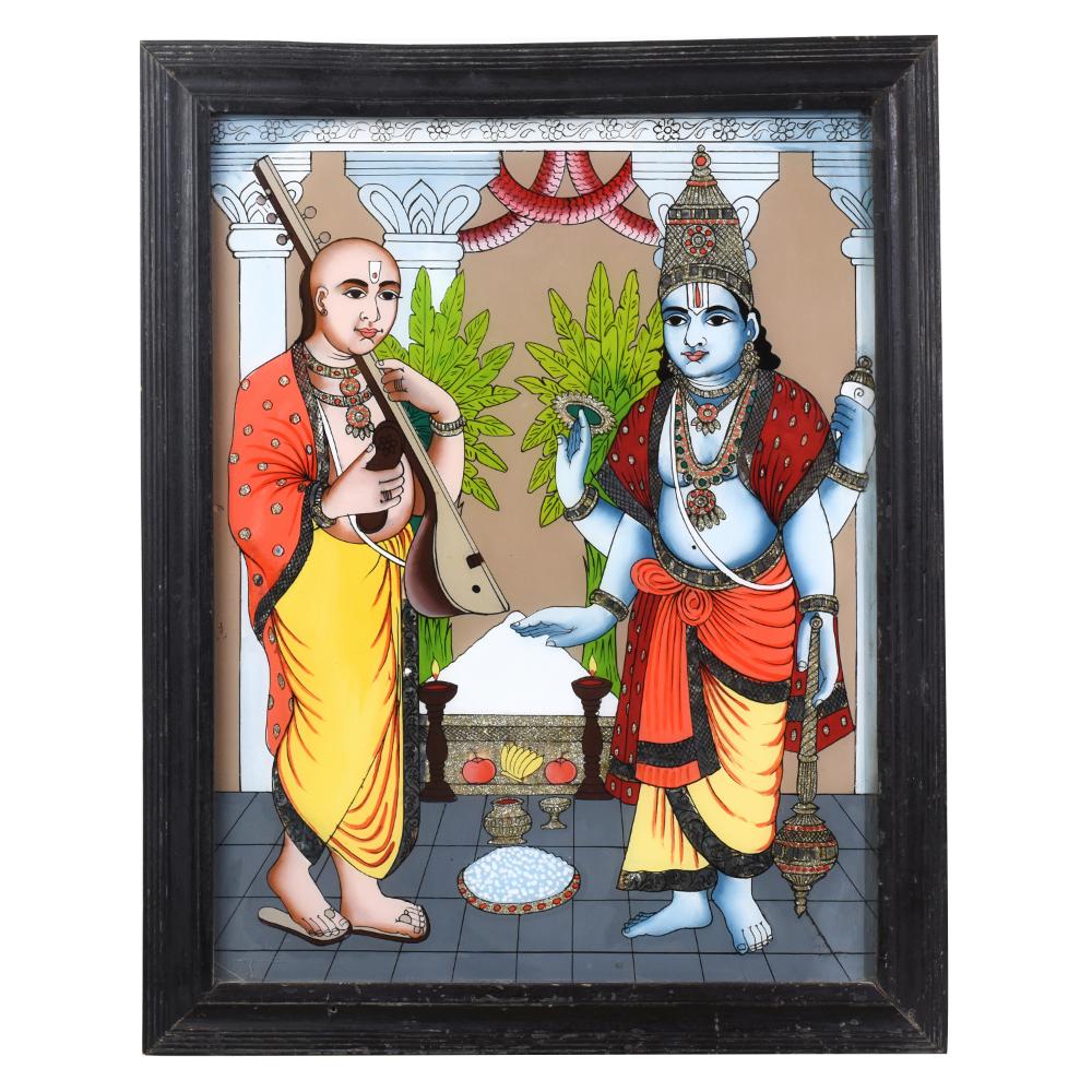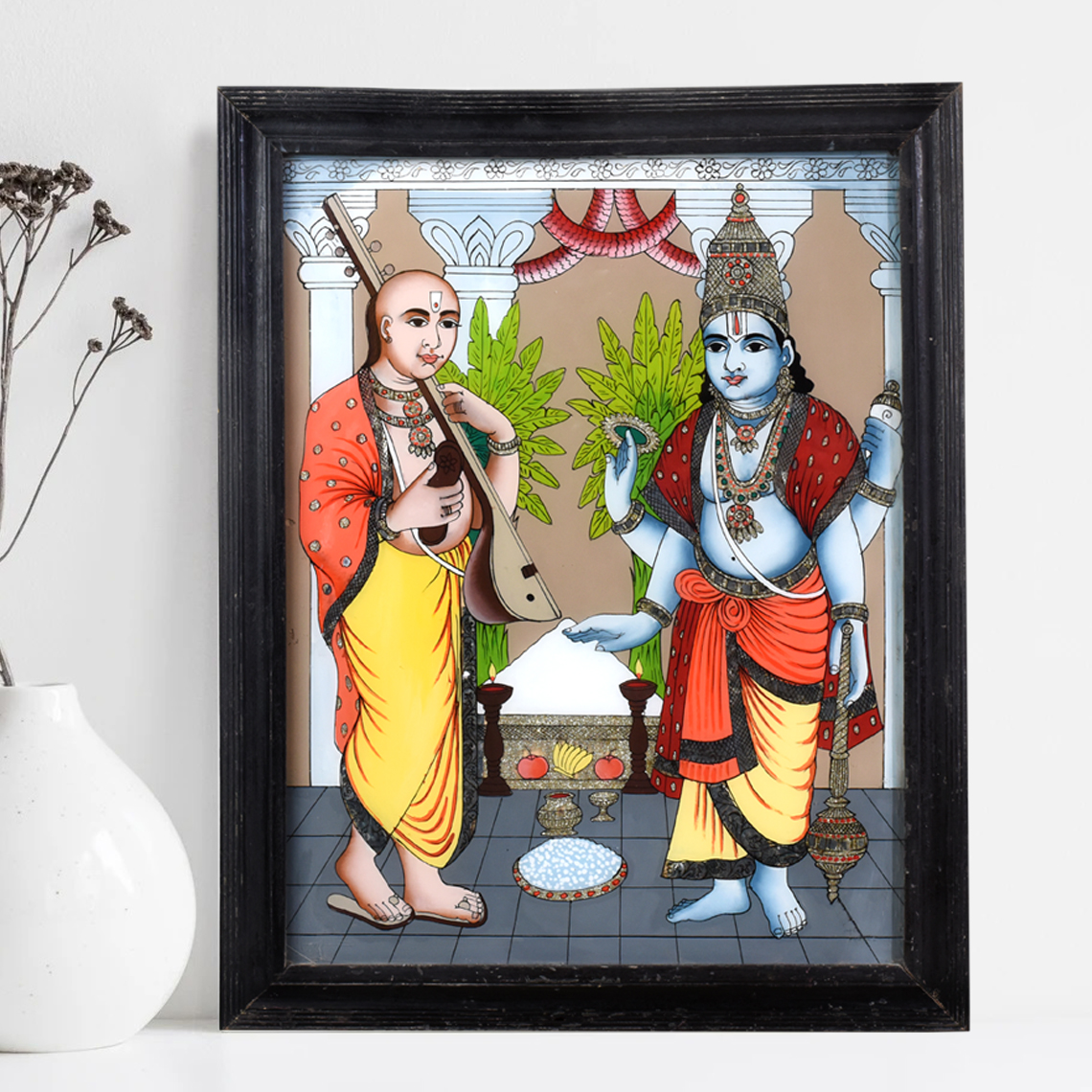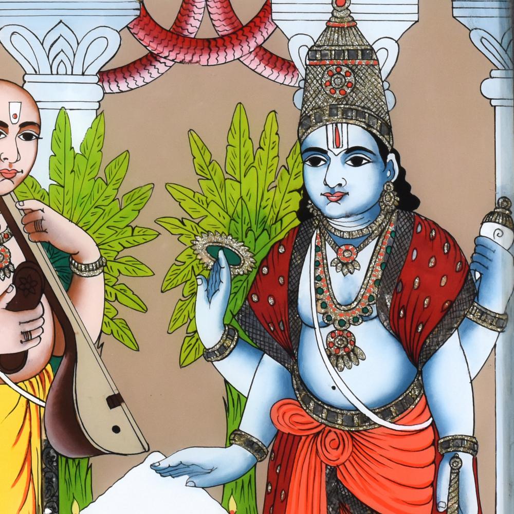 Bring the timeless magic of Indian mythology into your home with this breathtaking vintage glass painting of Lord Krishna and Sudama. This captivating piece depicts the beloved story of Lord Krishna and his dear friend Sudama. As the young Sudama, a poor brahmin, approaches his wealthy friend Krishna, the divine lord joyfully welcomes him, showering him with gifts and affection. This heartwarming tale of true friendship and compassion is a cherished part of Hindu culture. Infusing your space with the sacred energy of this iconic scene, this vintage glass painting will elevate your décor while inspiring reflection on the power of kindness, loyalty, and the unbreakable bonds between loved ones. Whether displayed in your living room, meditation space, or entryway, this exquisite artwork will command attention and spark uplifting conversations. Invite the divine presence of Lord Krishna into your home and let his timeless wisdom and grace illuminate your days.