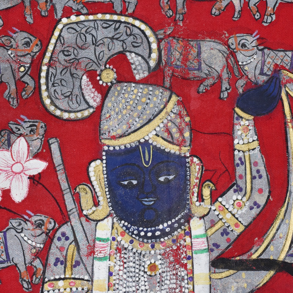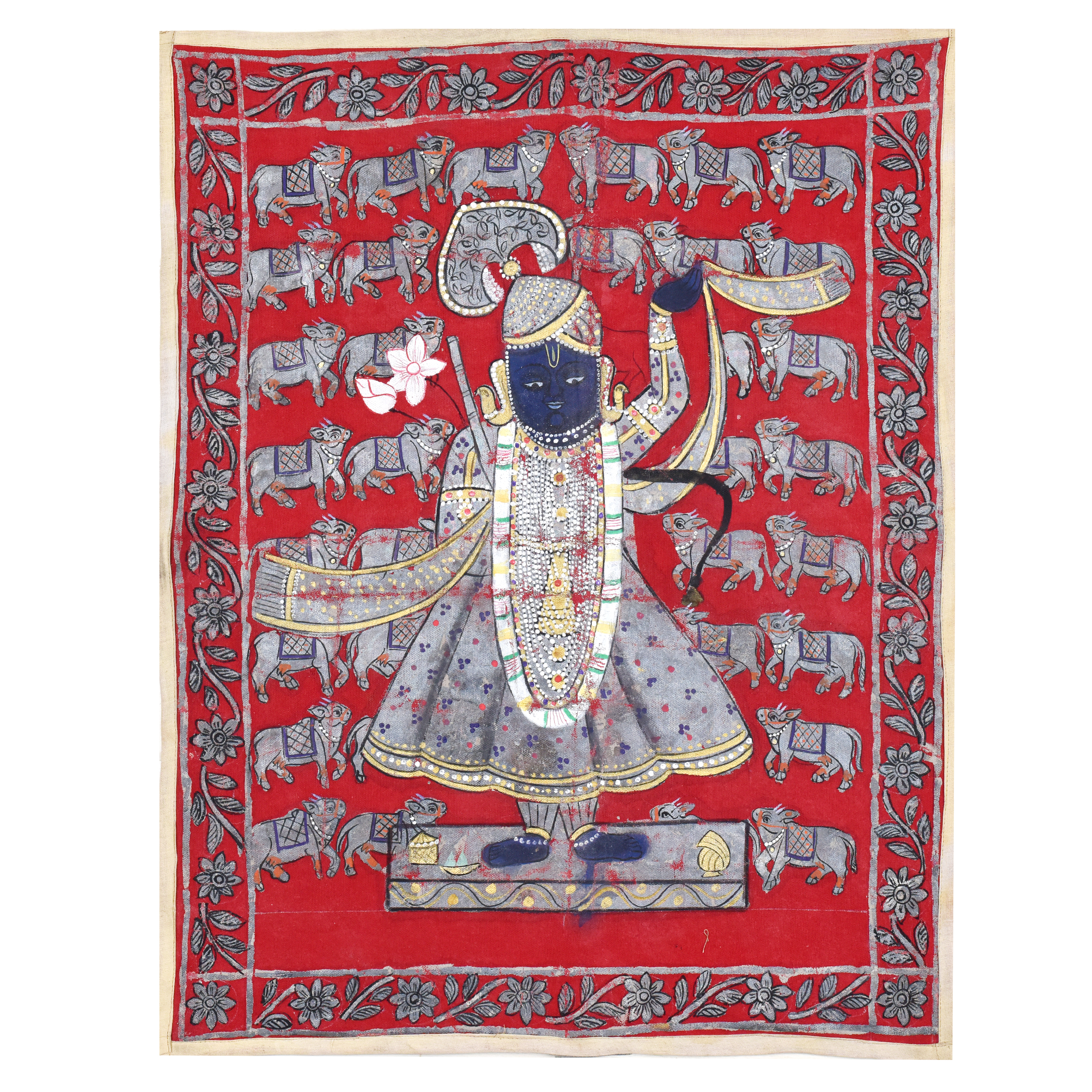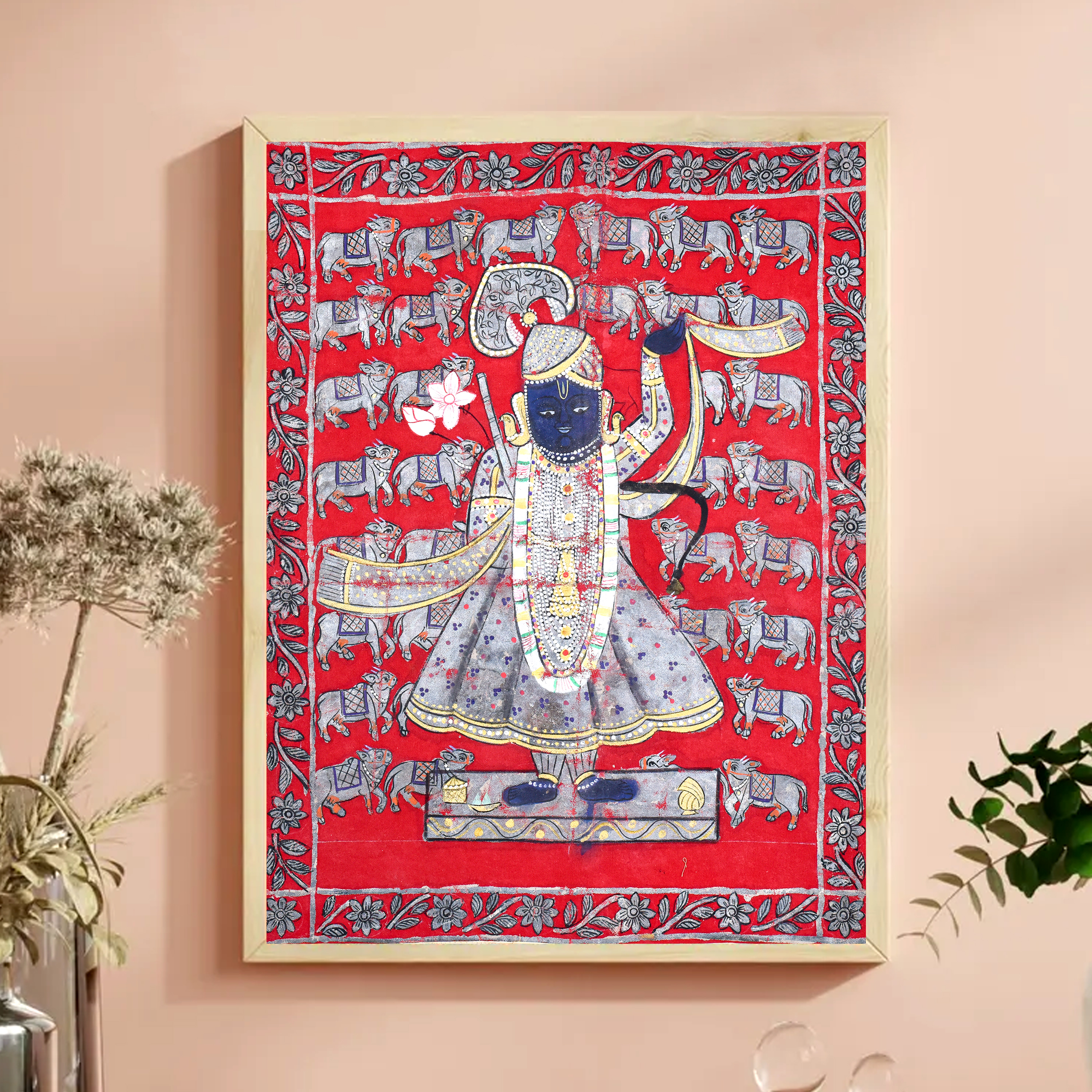 Bring the divine splendor of Lord Krishna into your home with this exquisite cloth pichwai painting without frame. Feast your eyes on the breathtaking depiction of the beloved deity, surrounded by a serene cow pattern and a vibrant floral border that will transport you to the lush, enchanting landscapes of Vrindavan. This cloth pichwai painting is not just a work of art - it's a gateway to a higher realm of spirituality and divine connection. As you gaze upon the mesmerizing image of Lord Krishna, you'll feel a profound sense of peace and inspiration wash over you. Let this exquisite piece become the centerpiece of your sacred space, a constant reminder of the infinite love and wisdom that radiates from the divine. Whether you're a devoted Krishna devotee or simply appreciate the beauty of Indian art, this cloth pichwai painting is a must-have addition to your home. Elevate your décor and enrich your spiritual journey with this stunning, one-of-a-kind masterpiece that will captivate and inspire all who behold it.
