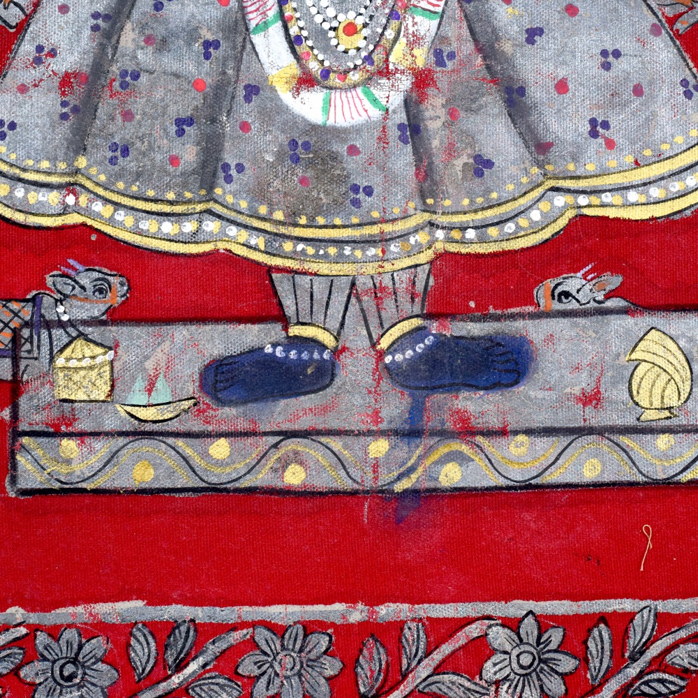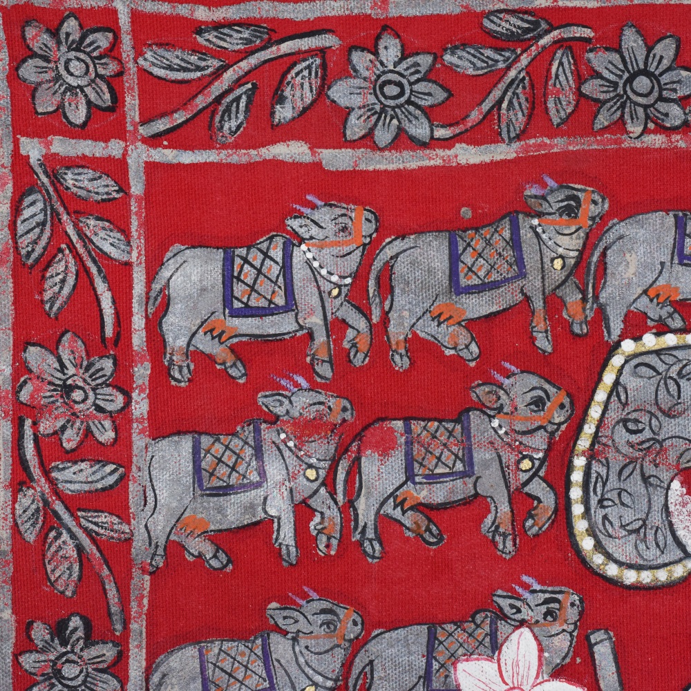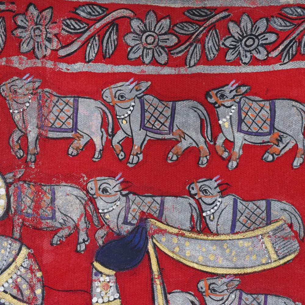 Bring the divine splendor of Lord Krishna into your home with this exquisite cloth pichwai painting without frame. Feast your eyes on the breathtaking depiction of the beloved deity, surrounded by a serene cow pattern and a vibrant floral border that will transport you to the lush, enchanting landscapes of Vrindavan. This cloth pichwai painting is not just a work of art - it's a gateway to a higher realm of spirituality and divine connection. As you gaze upon the mesmerizing image of Lord Krishna, you'll feel a profound sense of peace and inspiration wash over you. Let this exquisite piece become the centerpiece of your sacred space, a constant reminder of the infinite love and wisdom that radiates from the divine. Whether you're a devoted Krishna devotee or simply appreciate the beauty of Indian art, this cloth pichwai painting is a must-have addition to your home. Elevate your décor and enrich your spiritual journey with this stunning, one-of-a-kind masterpiece that will captivate and inspire all who behold it.