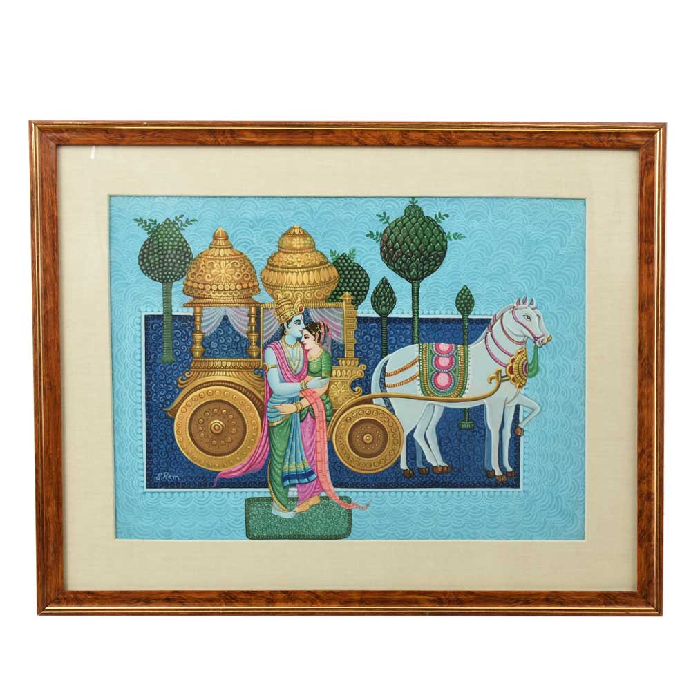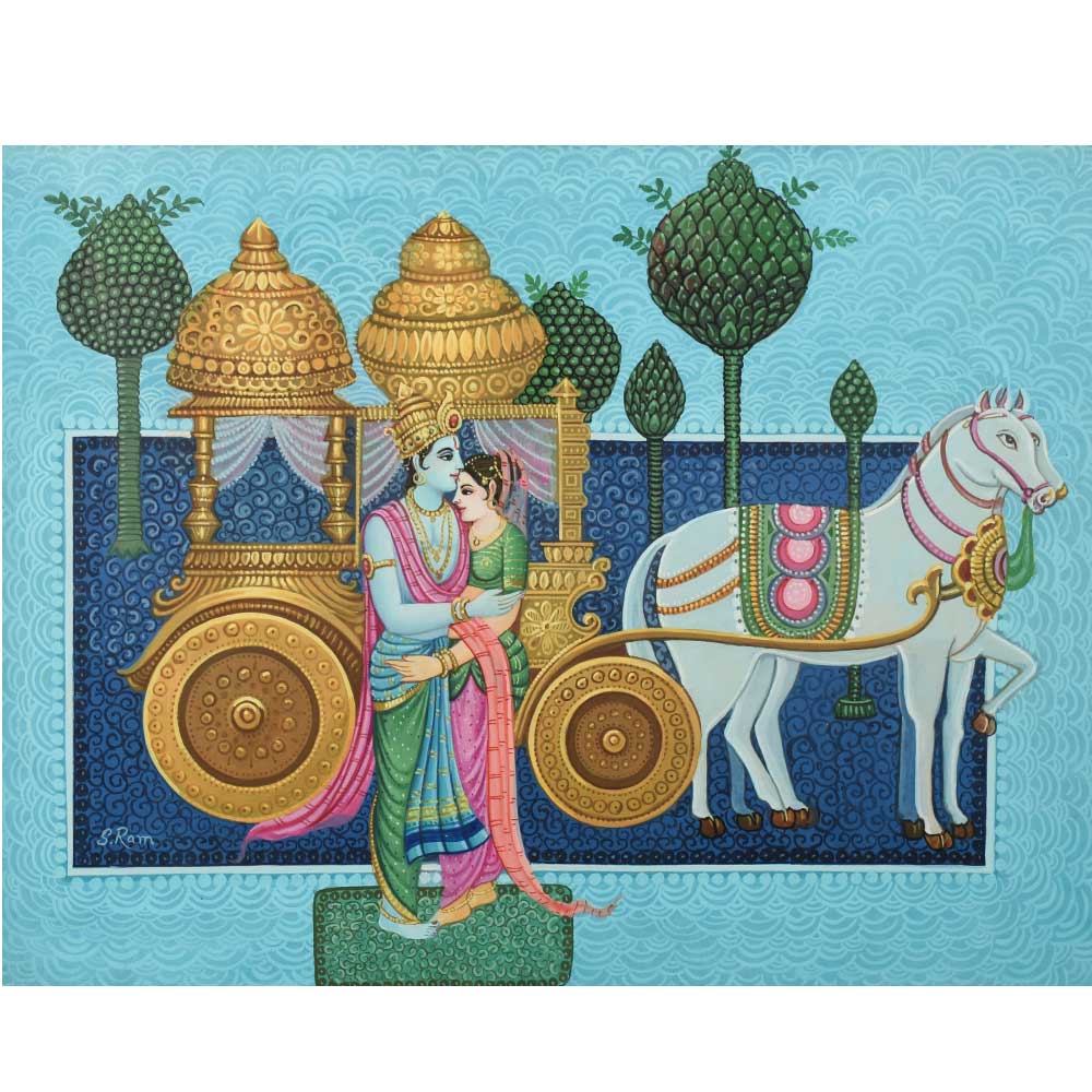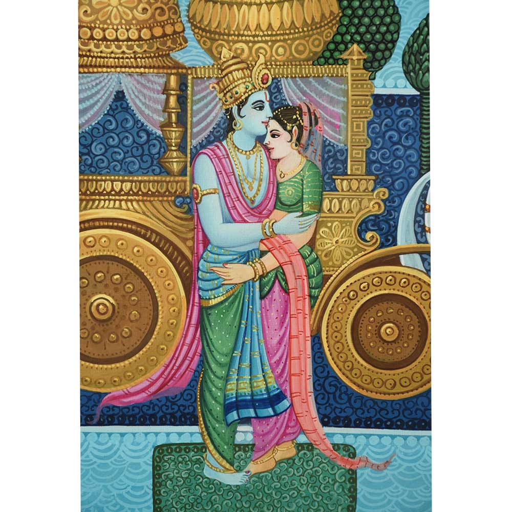 A graceful Calendar Art Painting of Lord Krishna engaged in an embrace of his wife Rukmini in front of a beautiful chariot.